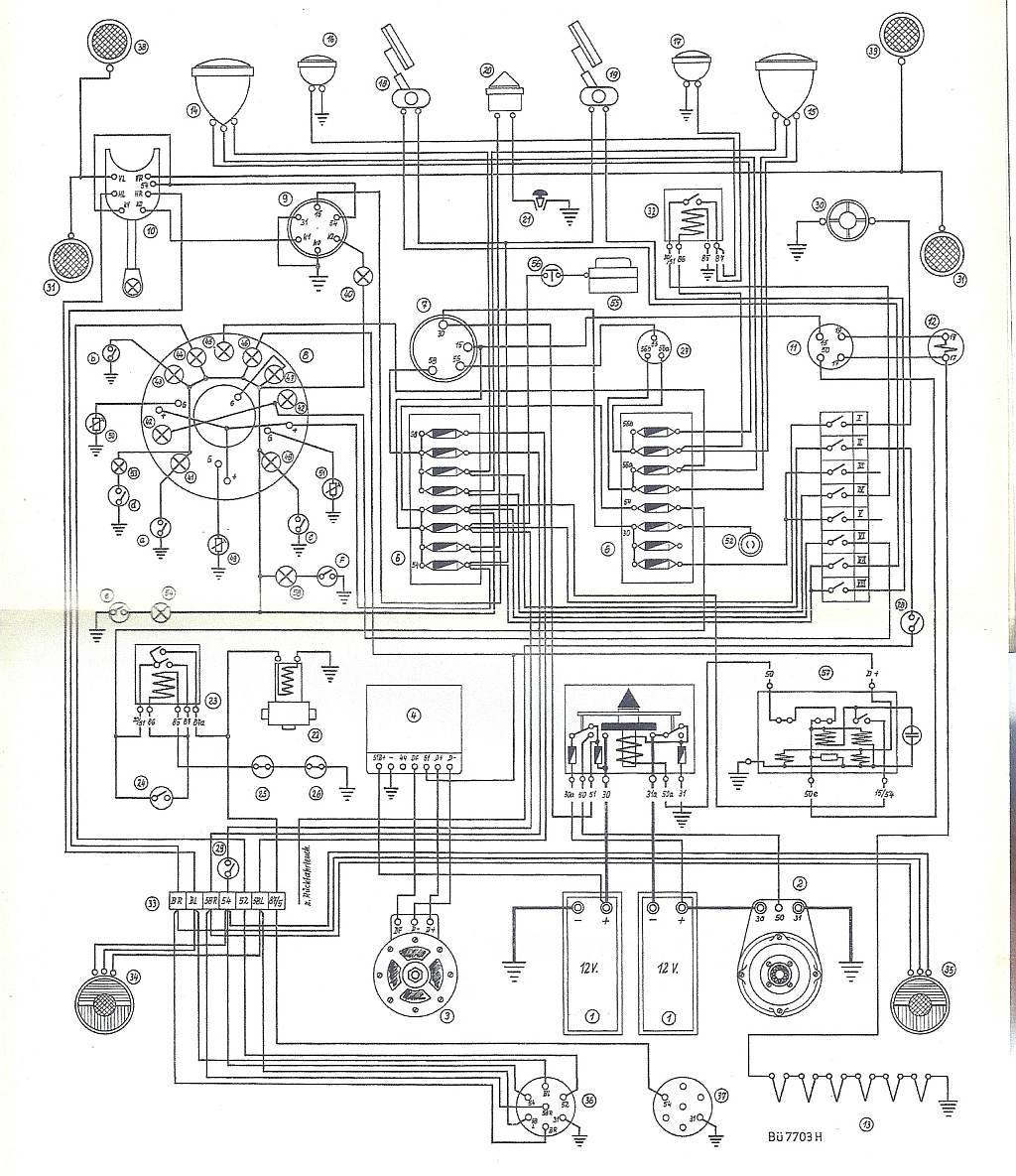 50 durchläuft eine ominöse Wiederholsperre (Teil 57) und kommt als 50a am Umschalter an! Dortselbst durchläuft der Strom die Magnetspulenwicklung, zieht damit den Magneten an und verschwindet an Masse (31).