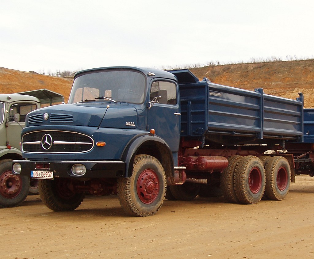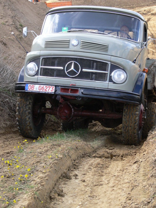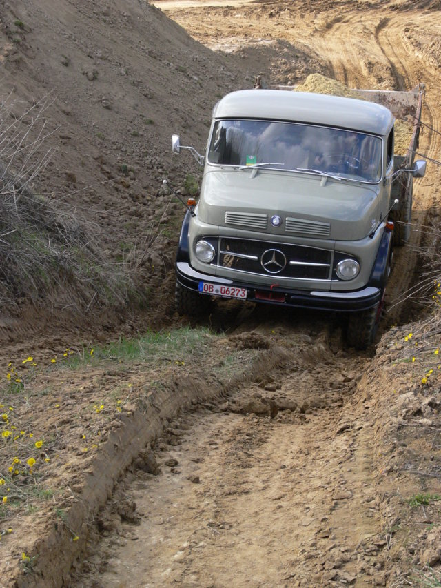 Wenige Zeit später entsann sich der Mercedesmann, dass auch die kleineren Kipper gut im Gelände waren und ein LAK 1413 war schnell gefunden. Heimlich, alleine wollte er es jetzt wissen und fuhr wieder zum Bagger. Zwei Löffel und der Versuch sollte starten. Schnell war das Testgelände wieder erreicht. Noch mal ein letztes Ansehen der Situation vor Ort und der Motor wurde gestartet. Langsam und souverän zog der 4 x 4 Mercedes die gleiche Steigung hoch, ohne zu murren. Kein Problem für Mensch und Material und so war bewiesen, dass Mercedes eben doch auf den Baustellen der Welt seine Berechtigung hatte. War das der Grund, warum aus Henschel eben Mercedes wurde?