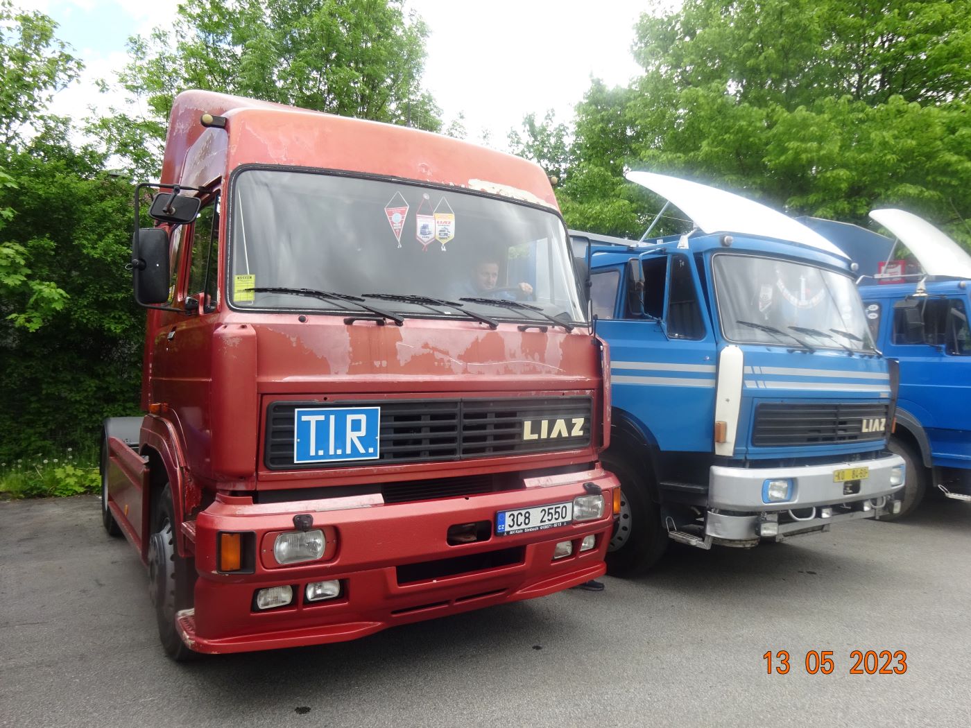 Die schon etwas verwitterte rote Zugmaschine kam mir bekannt vor. Beim Durchschauen meiner Fotos zuhause bestätigte sich meine Vermutung: dieser Liaz war in München als Schaustellerzugmaschine zuhause. Der Kratzer auf der Front und die Beschädigung oberhalb der Frontscheibe auf der Fahrerseite lassen keinen Zweifel.