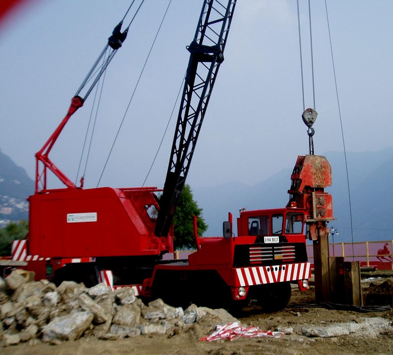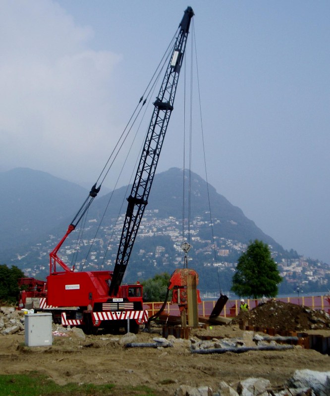 Dieser Seilbagger kann wie hier gezeigt als Ramme, als Kran und als Schachtbagger zu verwendet werden.