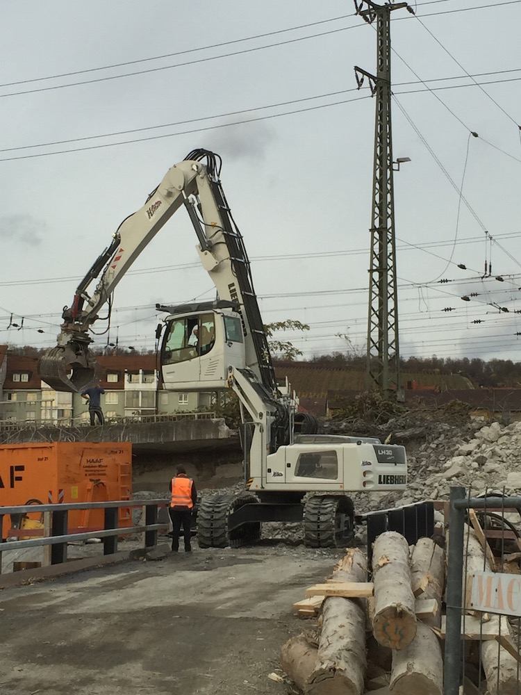 Ersteinsatz eines nagelneu angelieferten LH30 der Fa. Kellner bei einem Brückabriss in Würzburg.