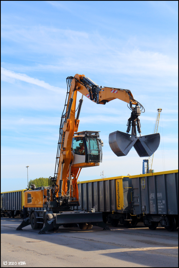 Die radmobile Version des Liebherr LH30, hier bei der Entladung eines Zuges.