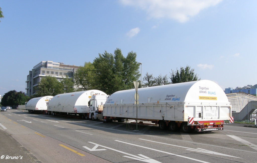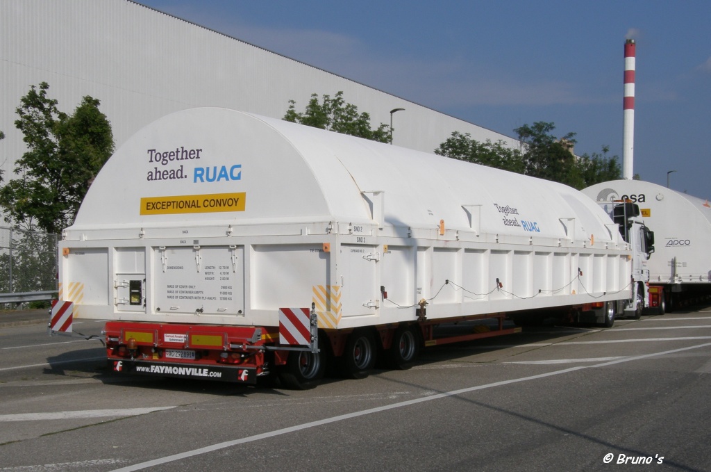 Samuel Amsler war mal wieder mit 3 leeren Container für die Nutzlastverkleidungen unterwegs, nach Emmen zu der Ruag. Die grossen 2 Container sind für die Ariane Raketen, und der kleine ist für Vega Rakete. Von den kleinen Container gibt es nur noch 2 Stück, die anderen wurden verschrottet. (wegen nicht Gebrauchs)