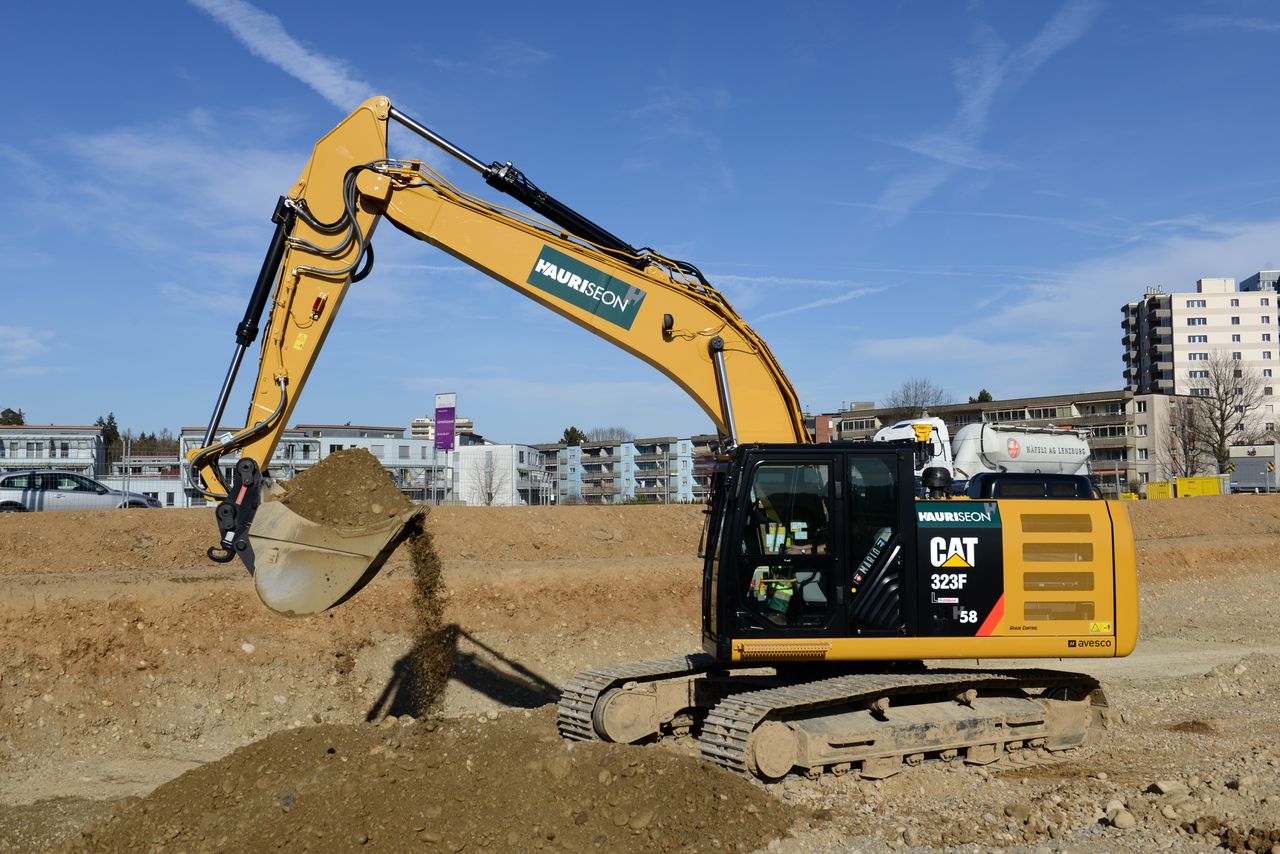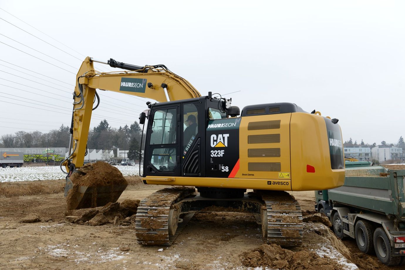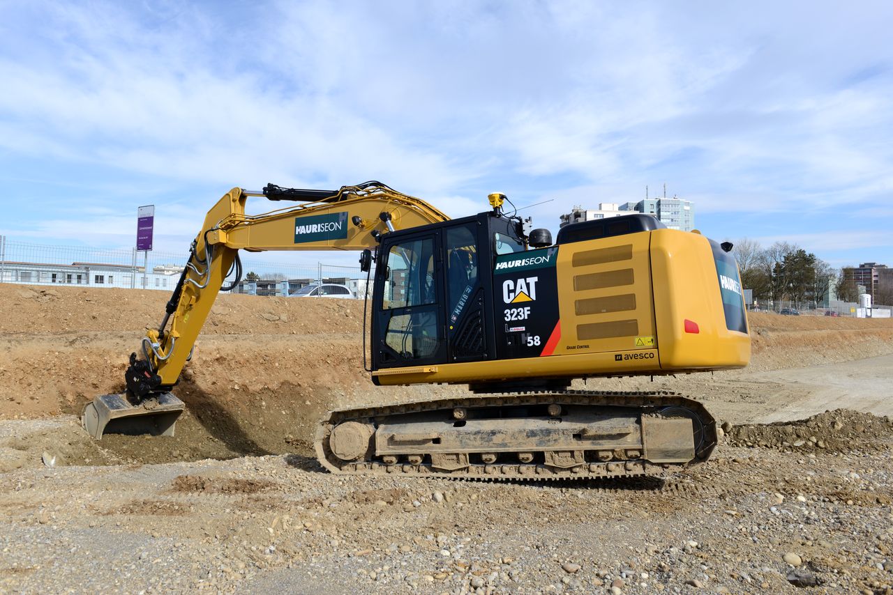 Ein Caterpillar 323F L der Schmitz Straßen- und Tiefbau GmbH bei Erschließungsarbeiten in Heede: