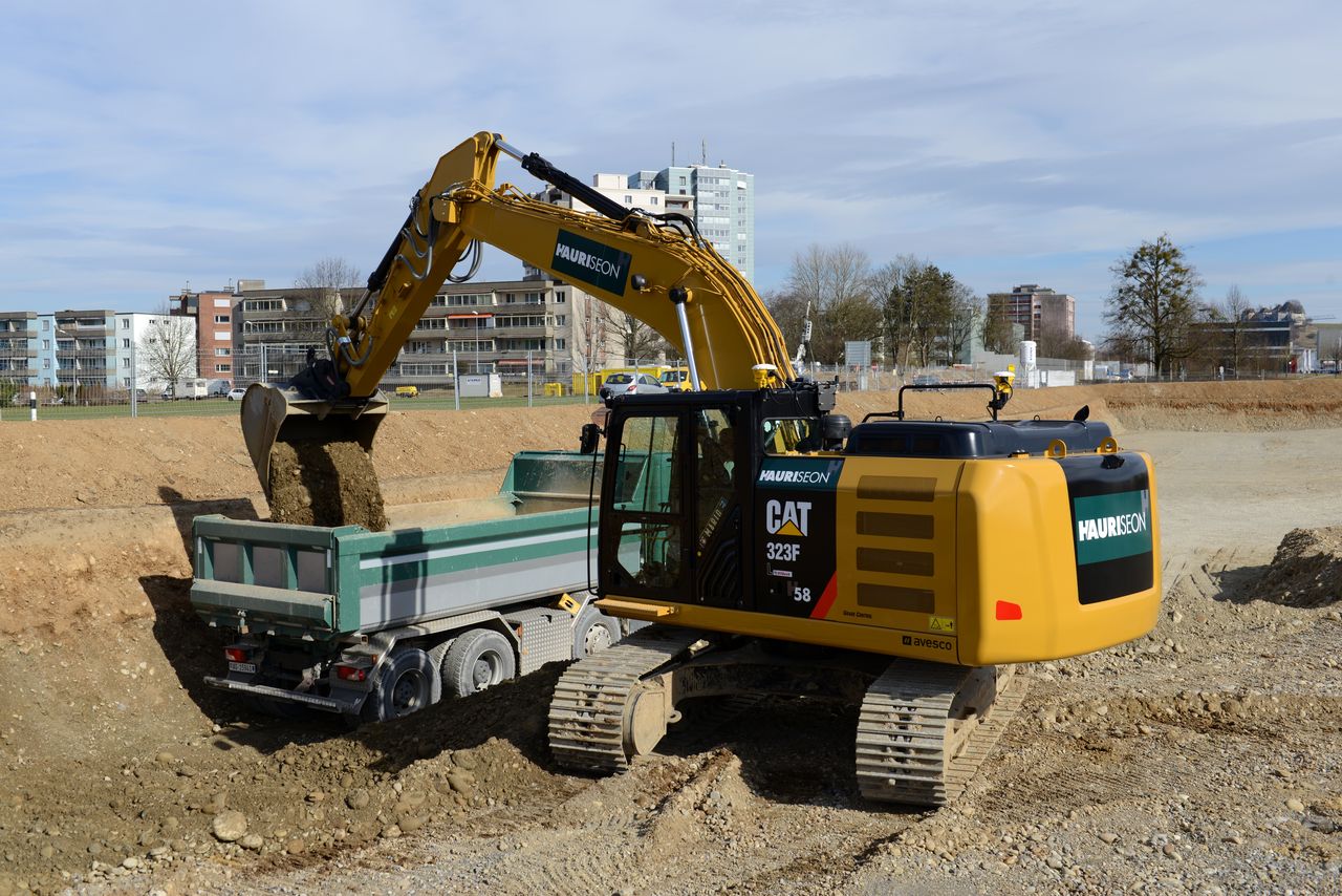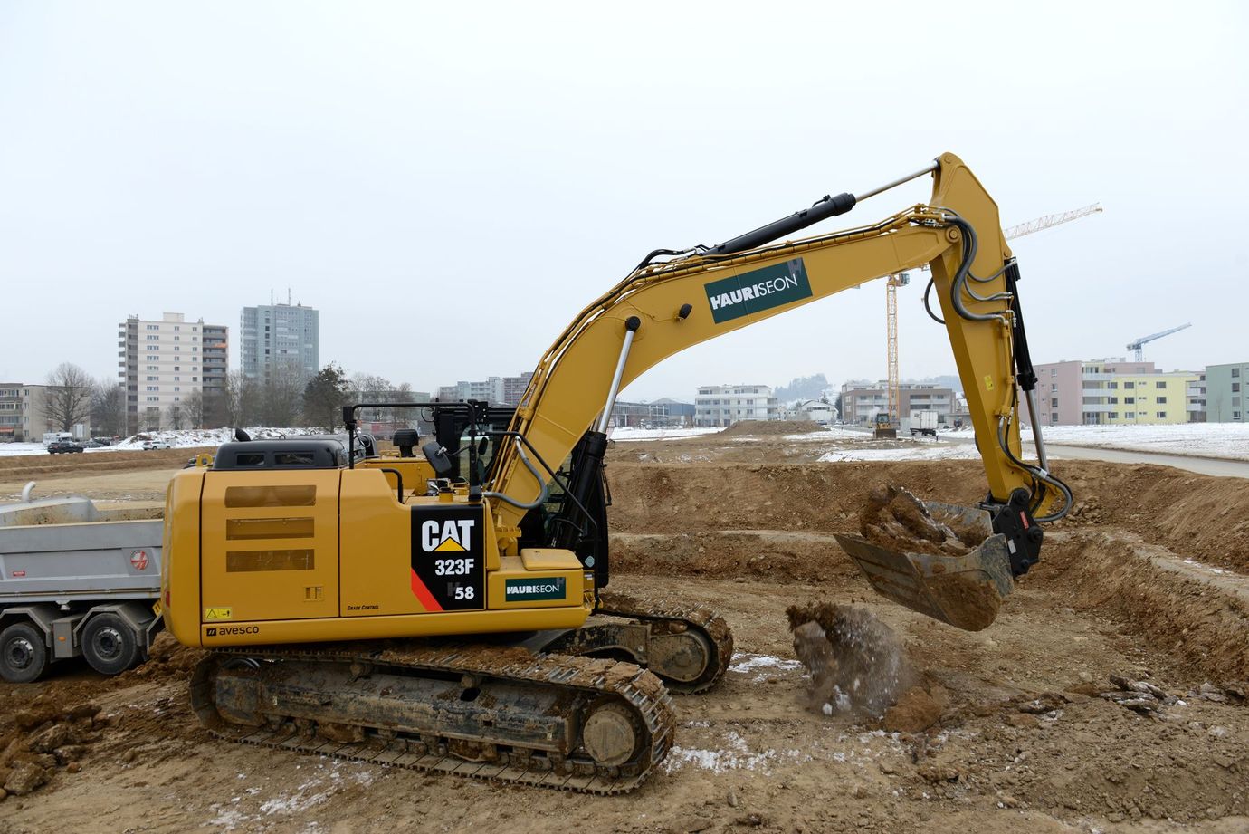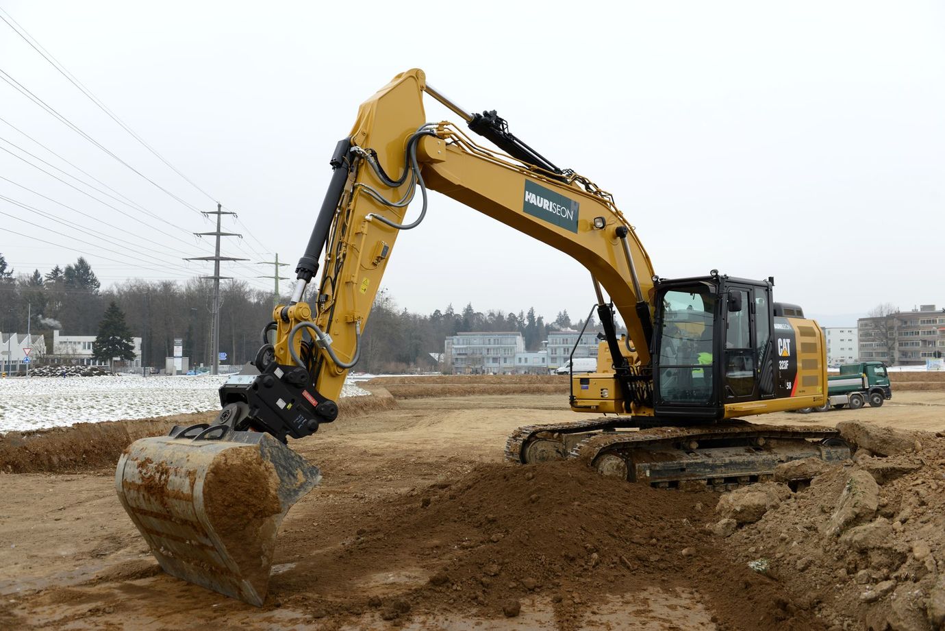 Ein Caterpillar 323F L der Schmitz Straßen- und Tiefbau GmbH bei Erschließungsarbeiten in Heede:
