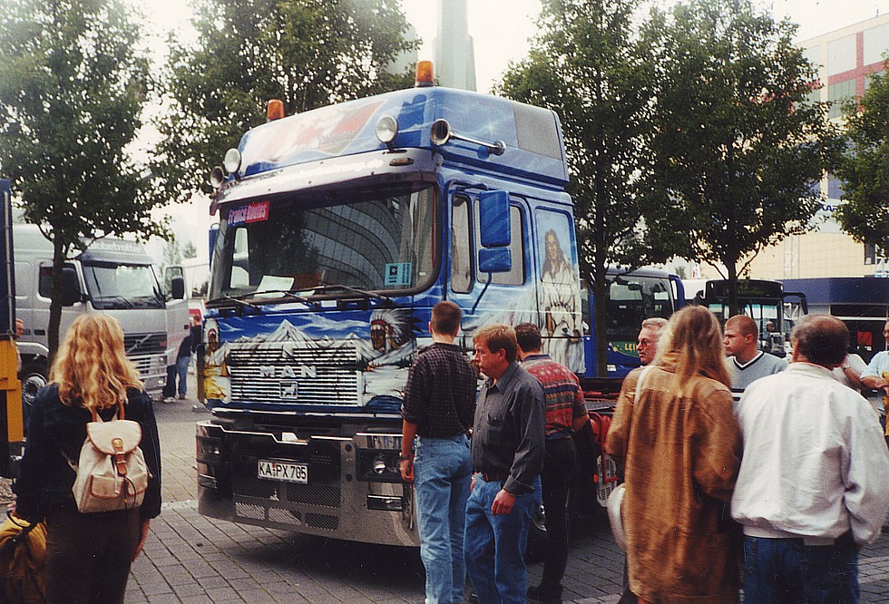 Auf dieser bescheidenen Aufnahme (leider auch wieder linke Seite) von der IAA 2000 zeigte sich die Zugmaschine noch ohne montierten Rammschutzbügel.