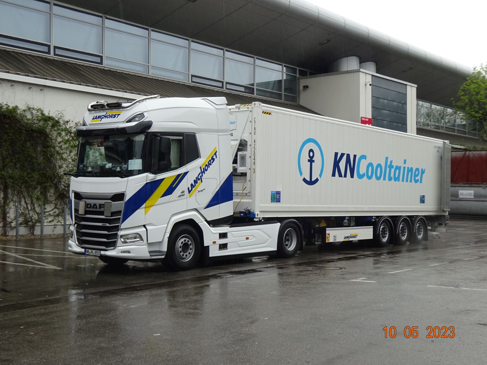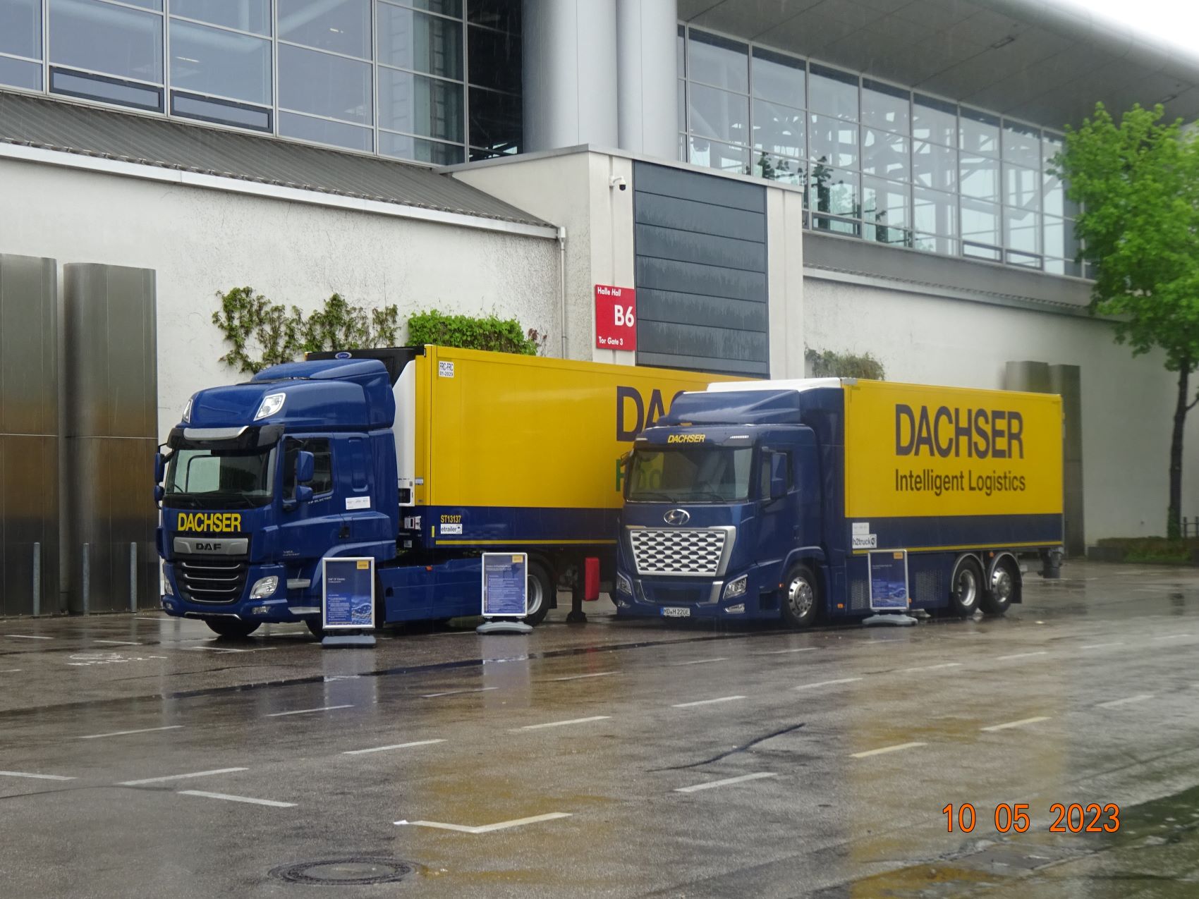 Inzwischen hatte der Regen nachgelassen, und ich konnte zwischen den Messehallen ausgestellten LKW halbwegs vernünftig auf Speicherkarte verewigen. Die beiden Dachser-LKW, die ich gestern schon beim "Waschvorgang" gezeigt habe, waren zum einen ein Hyundai Xcient Wasserstoff-LKW mit 27 t Gesamtgewicht und 11,5 t Nutzlast, und zum anderen ein DAF CF electric mit ebenfalls elektrisch betriebenem Kühlauflieger.