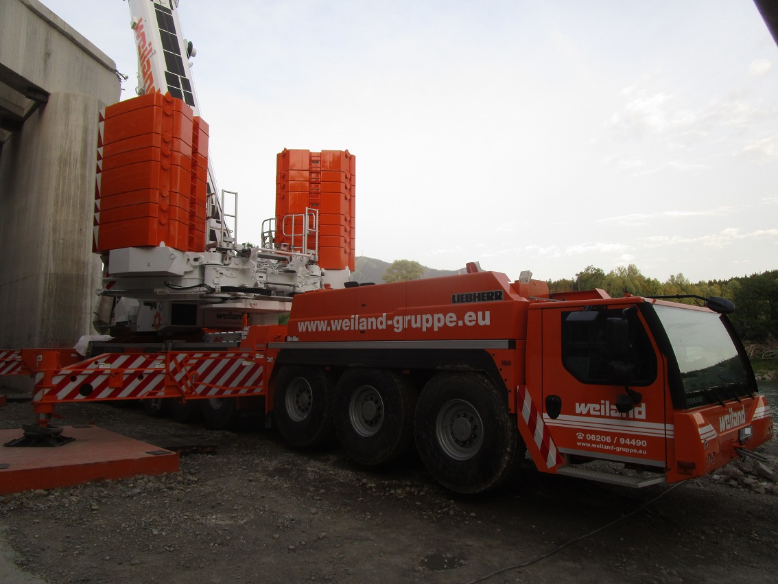 Das Brückenbauwerk, wurde mittels Betonsäge zersägt und mit diesem Kran abgetragen. jo