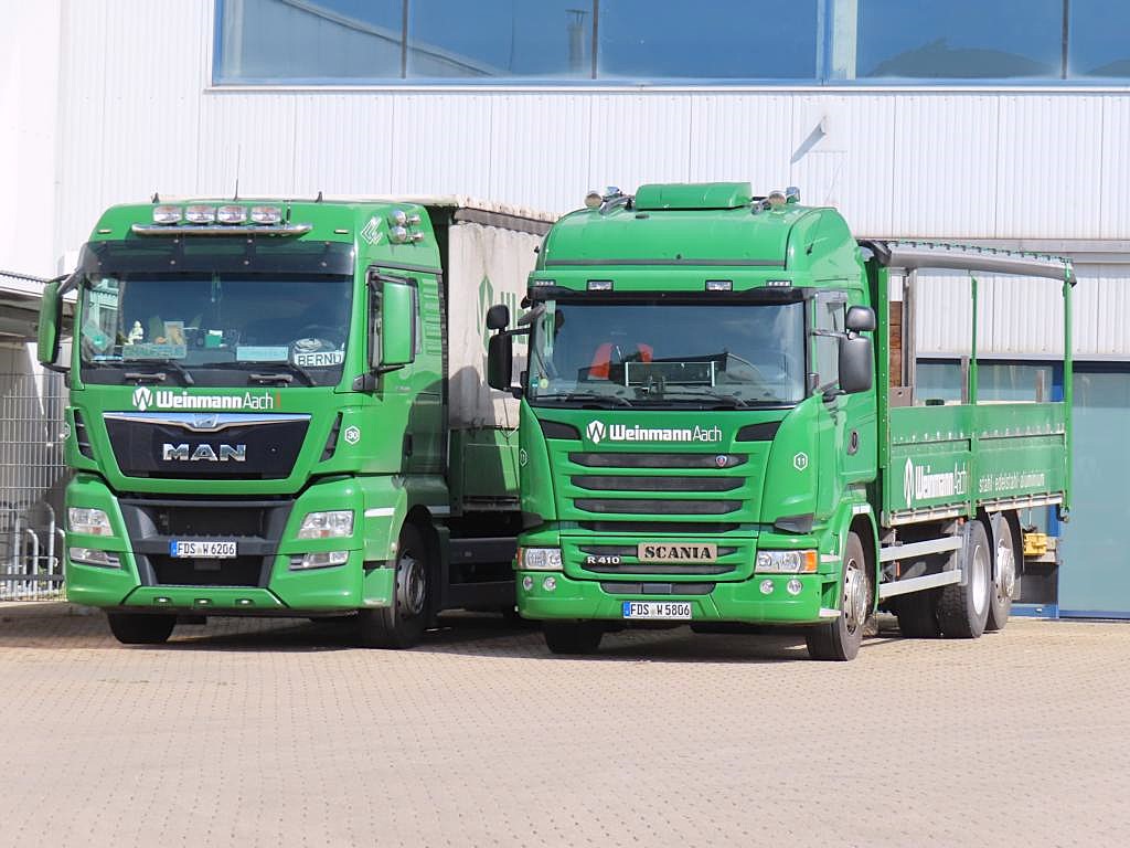 Ich kenne die Firma Weinmann schon von Kind auf... Die Firmenfarbe der LKWs war schon immer grün mit dem weißen Firmenlogo Weinmann Aach! In den 70iger Jahren waren es hauptsächlich Hanomag Henschel und Fiat LKWs die die Ware zu den Kunden auslieferten. Leider habe ich keine Bilder auf Papier von damals.... und nur im Kopf wall Der Fuhrpark bestand damals aus ca. 7 bis 8 LKWs... Kein Vergleich mehr zu heute! daumen