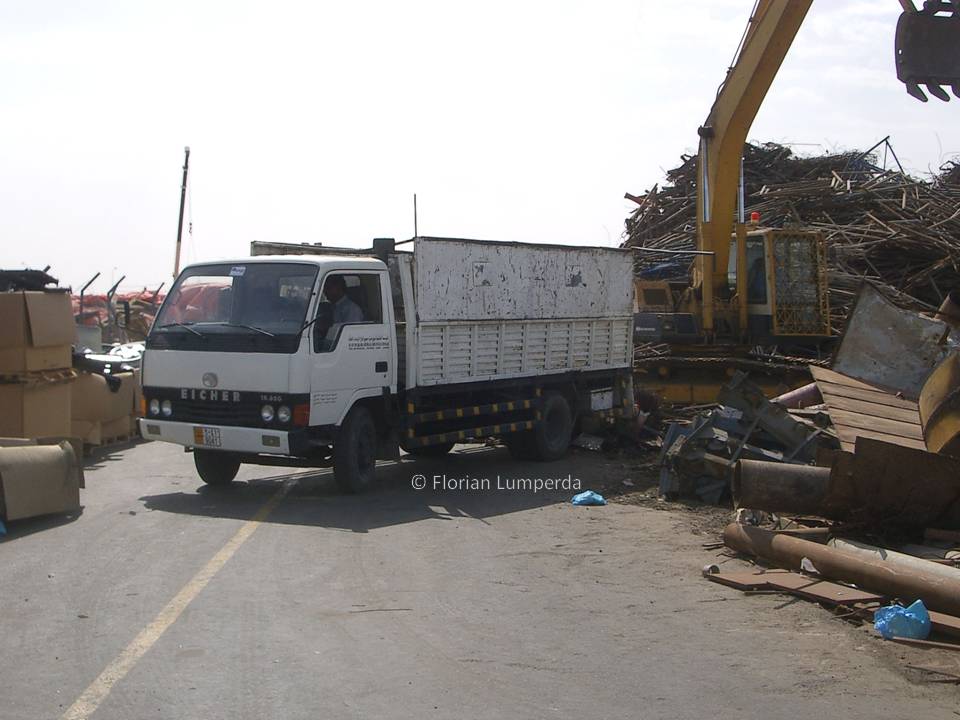 Meist Tatas und Ashok Leylands... Dafür aber einen kleinen Eicher 10.60 als 6-Tonner beim Anliefern auf einem Schrottplatz in Dubai. Unverkennbar die alte Kabine des Mitsubish Canter.