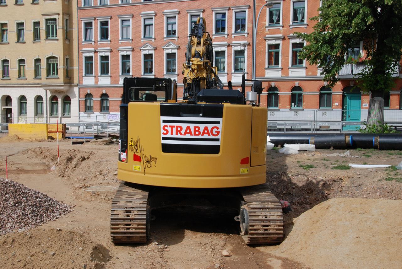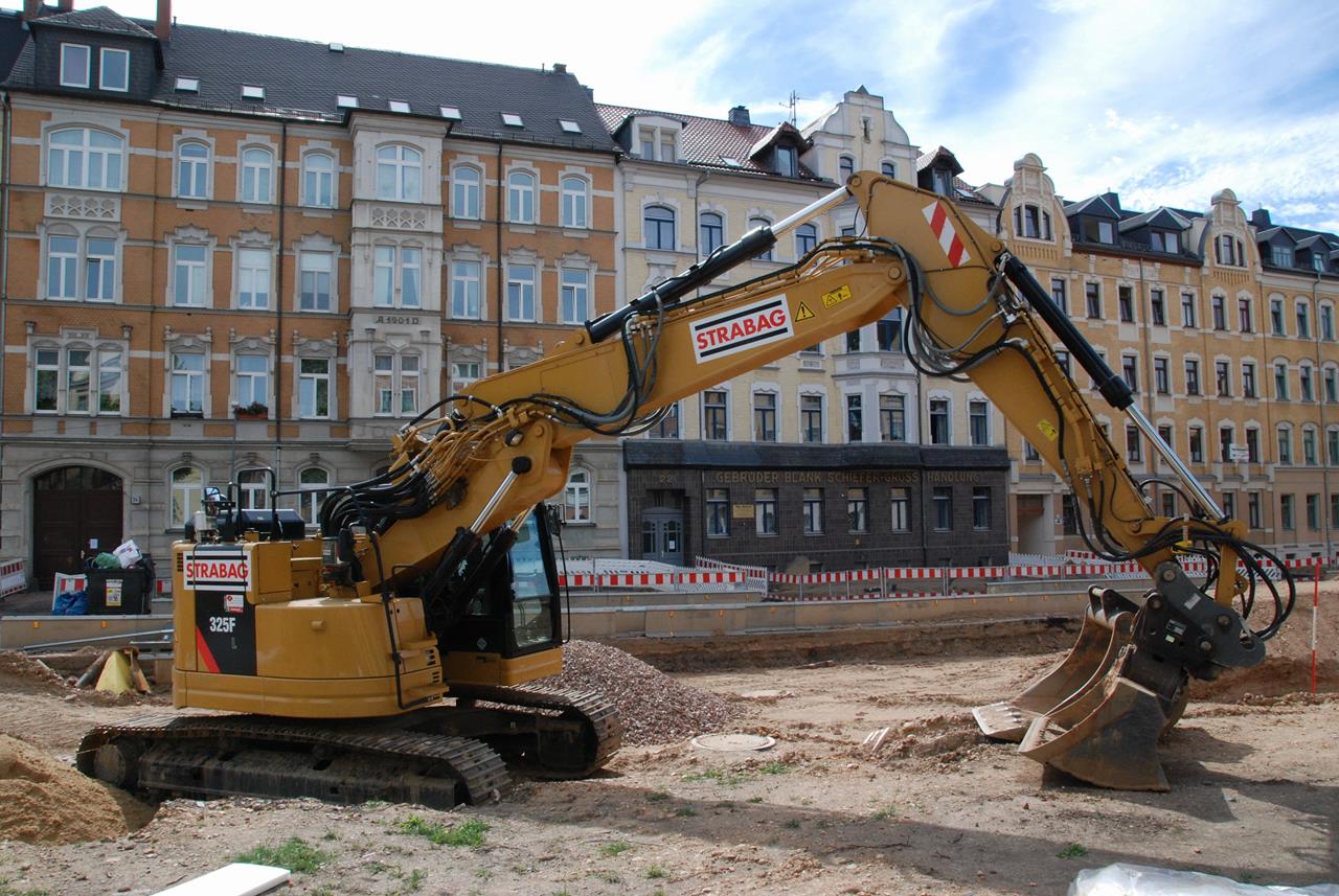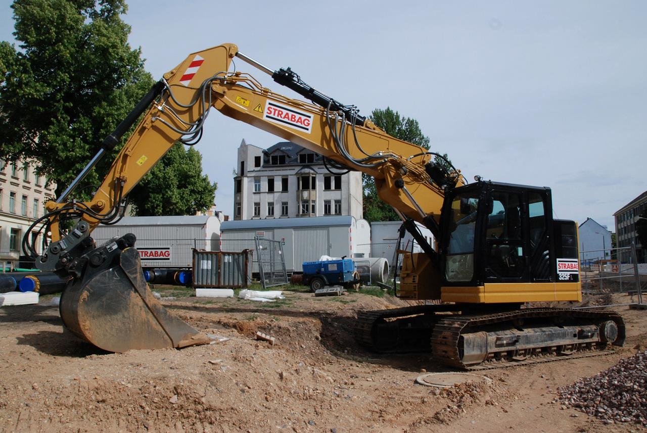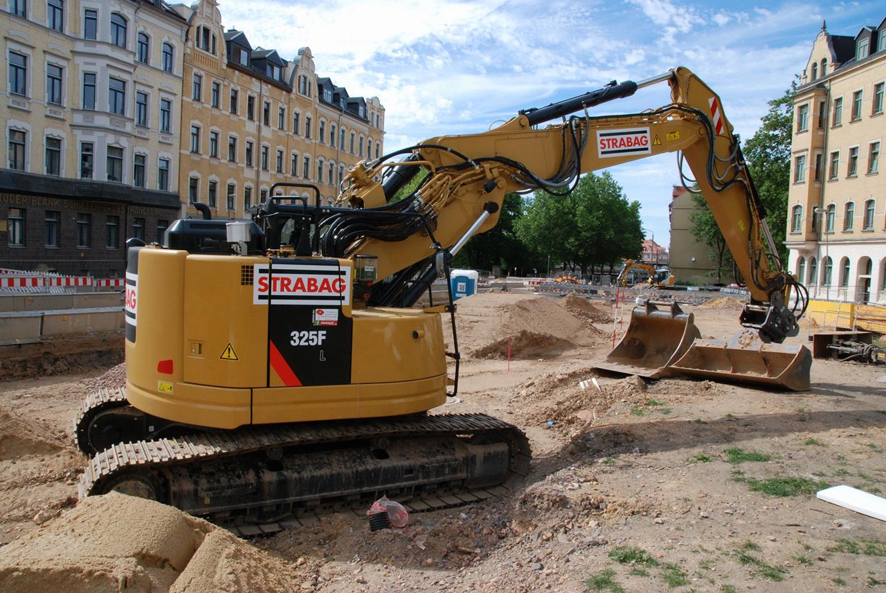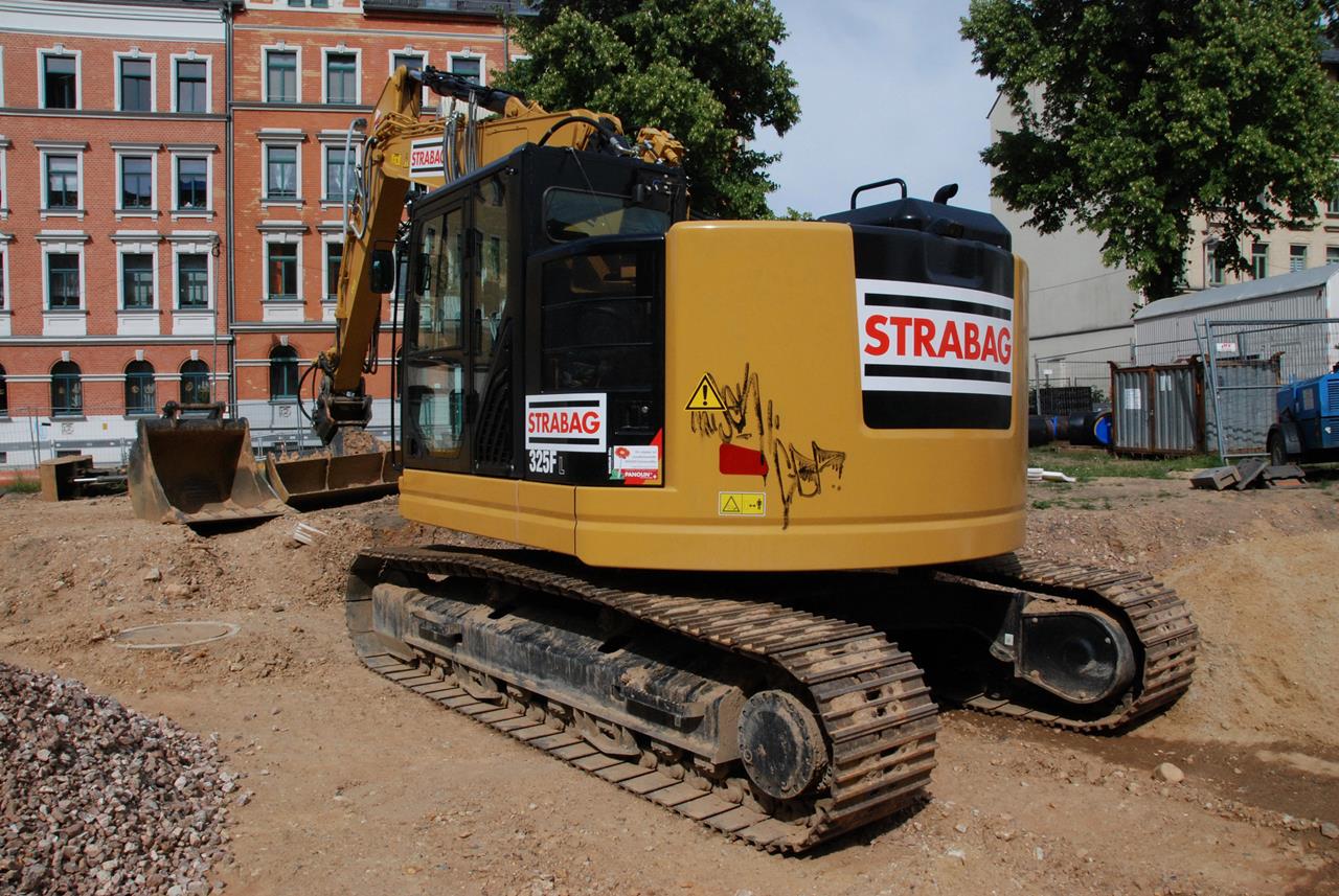 Den neuen Bagger 325F LCR, der leider schon durch Vandalen beschmiert wurde, setzt die STRABAG beim Kanalbau ein. Ein rundum optisch gelungener Bagger.