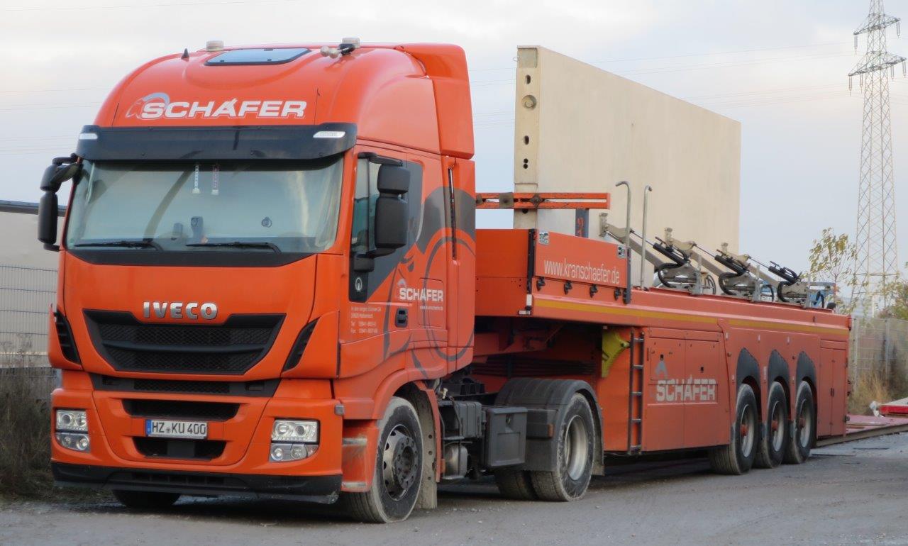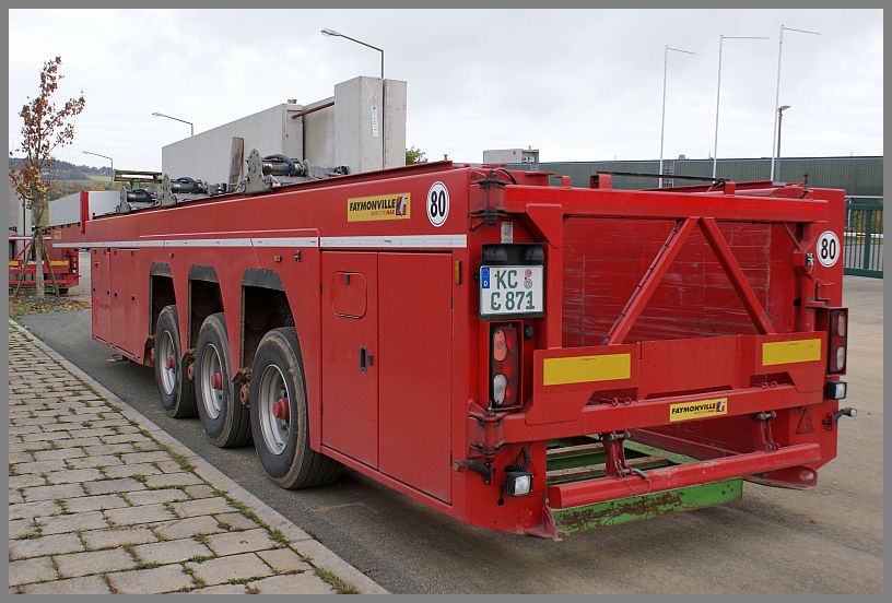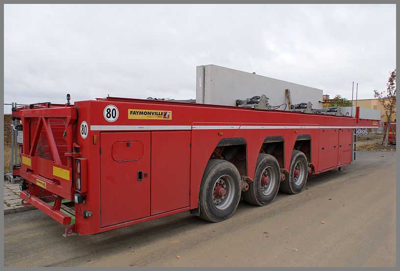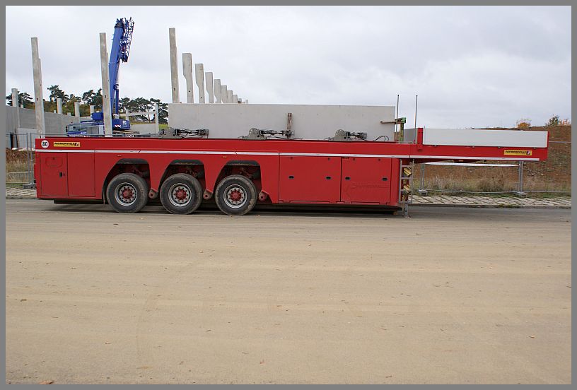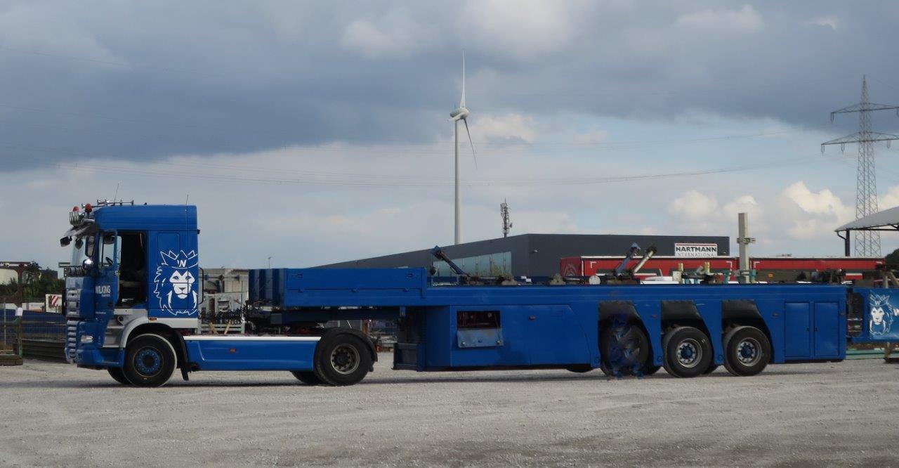 Innenlader-Auflieger sind meistens unter den typischen Schwertransport-Unternehmen abgelegt. Der Bick lohnt aud die Details, deshalb dieses Bild aus der Seitenansicht.