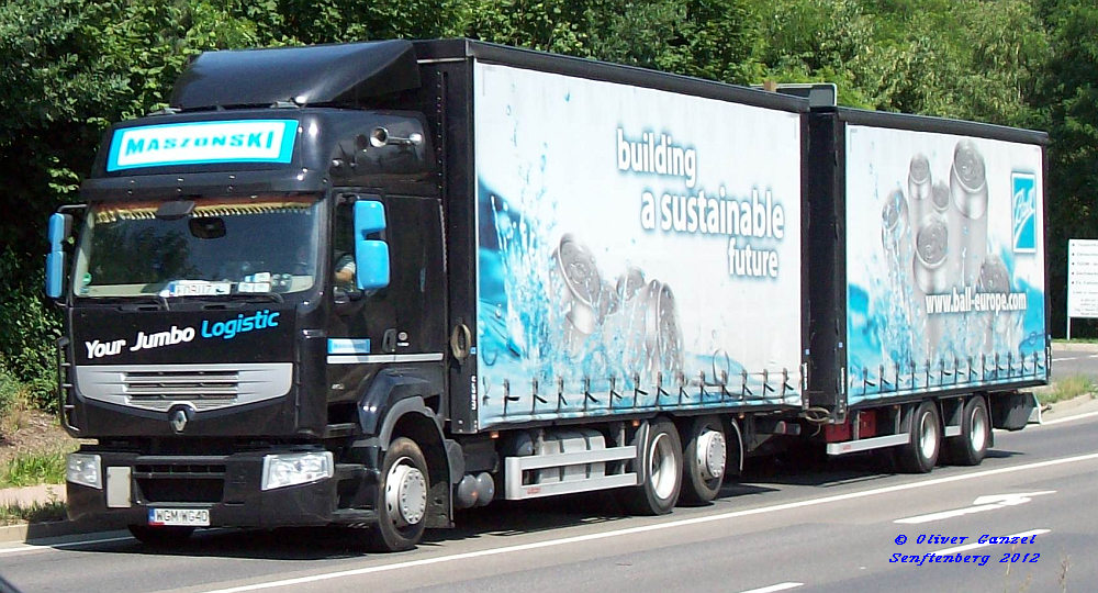 Renault Premium Tandem-Hängerzug mit wecon Gardinenplanenaufbau, Maszonski Logistic (PL) - unterwegs für Ball Europe