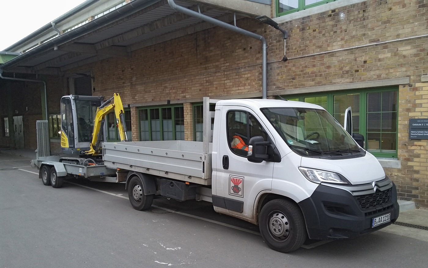 ein Citroën Jumper mit einem Humbaur-Anhänger und einem Wacker-Neuson ET 18 mit Hammer und Löffel.
