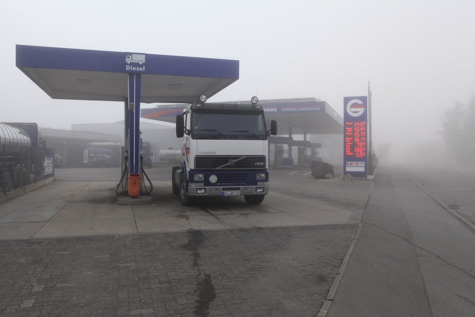 Die erste Tätigkeit heute: Zuerst Andreas in Bad Arolsen abholen, dann das reichliche Gepäck verstauen, weiter nach Korbach fahren, um zu tanken. 550 Liter Diesel passen in den Tank. Danach treffen wir uns alle bei Mercedes Brand, wo der vorgeladene Koffer-Auflieger steht, um ihn aufzusatteln.