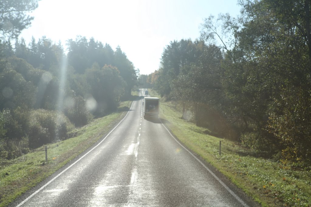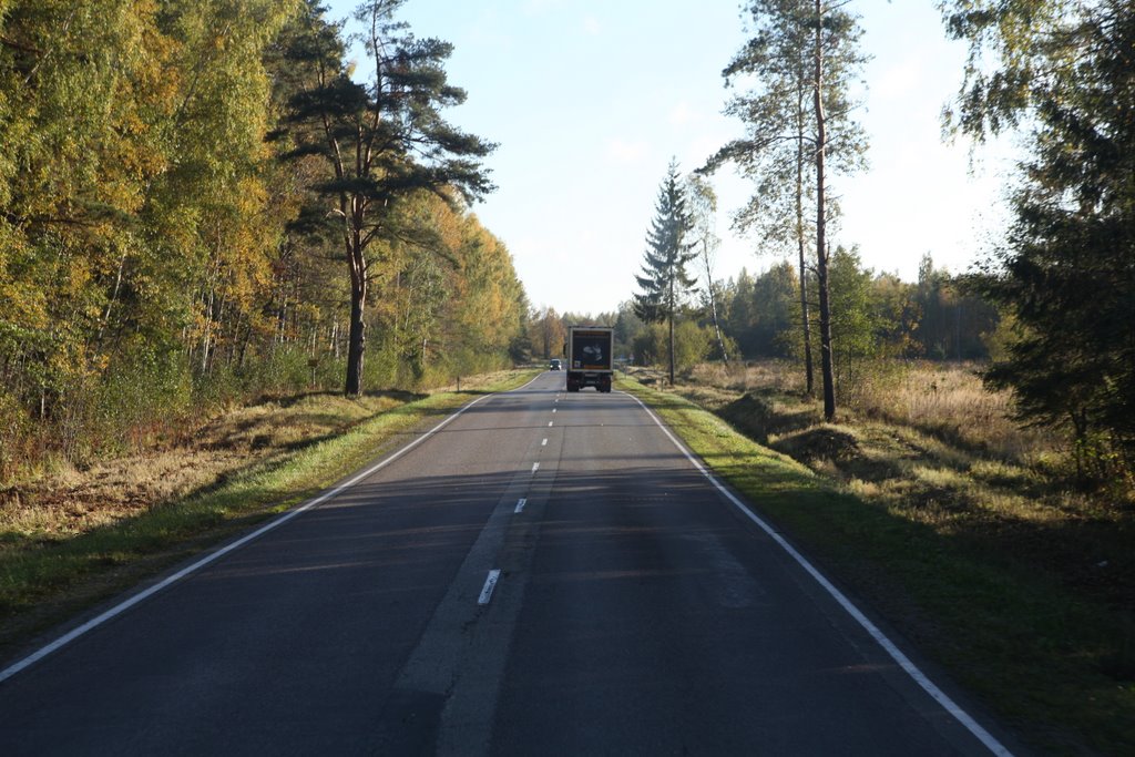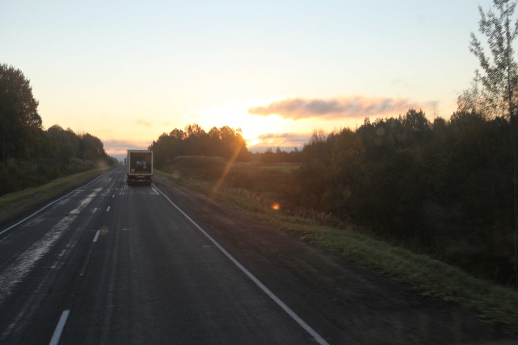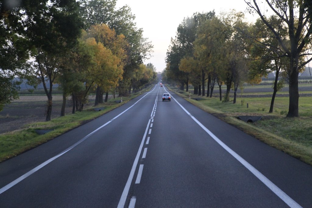 Noch dreimal wird auf der Hinfahrt umgetankt. Laut Tachoscheibe sind das mehr als zwei Stunden aktiver Verlust an Fahrzeit. Durch Warschau kommen wir ohne Probleme, danach über Straßen, manchmal mit Spurrinnen, die den Fahrer schon fordern, den Zug auf der Straße zu halten. Dann sind es wieder neue Straßen, die durch eine leicht hügelige Landschaft führen. Es geht langsam voran.