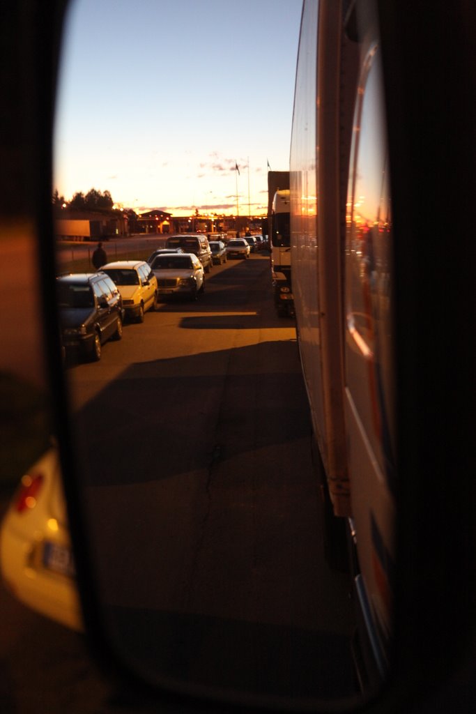 Nun wird es wieder spannend. Wir müssen an einem ca. 4 km langen LKW-Rückstau vorbei. Es geht nicht sehr zügig weiter und die bösen Blicke der Fahrer, die hier schon Stunden lang anstehen, kann man nachvollziehen. Nun stehen wir in der PKW-Spur und erste Diskussionen kommen auf: Sollen wir weiter auf der PKW-Spur bleiben oder uns jetzt rechts reindrängen? Wir bleiben bis zum Schlagbaum auf der PKW-Spur und hoffen, dass der russische Zoll uns das durchgehen lässt. Wir haben schon 295 LKW überholt, die noch im Grenzrückstau stehen, und haben aber um 21:45 Uhr immer noch 500 Meter bis zur ersten Kontrolle. Das WOMO mit Walter ist dort bereits angekommen.