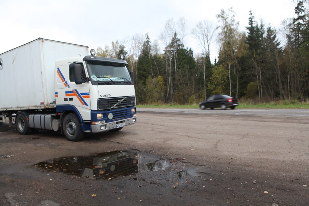 Um 2 Uhr morgens stehen wir bei den Letten. Wieder einmal Chaos. Welche Spur die richtige ist, kann man nicht erkennen und so warten wir auf nette Zöllner. Eine Stunde später werden die LKW gescannt! Die Zöllner sind hier fast bösartig. Den Parkplatz auf der Tankstelle erreichen wir gegen 5 Uhr, nun ins Bett!