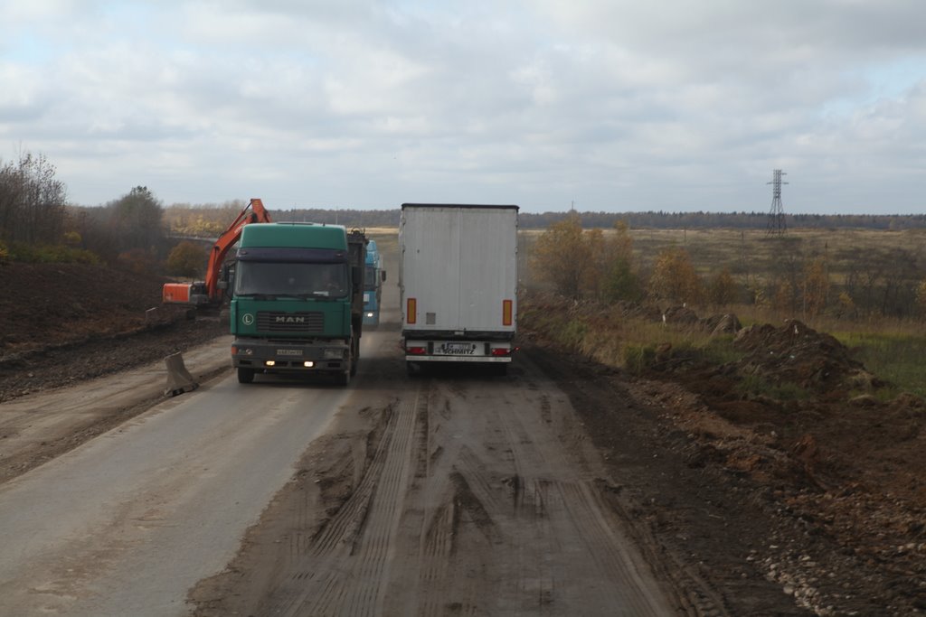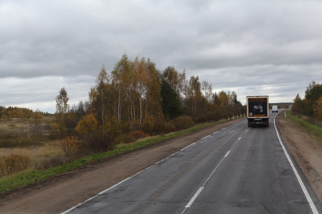 16:45 Uhr. Wir verlassen den Autobahnring von Moskau auf der M8 Richtung Jaroslawl. Die neue Autobahn führt durch eine vom Herbst geprägte Waldlandschaft und wir nähern uns unserem Ziel. Thomas Korte sendet jetzt noch eine Live-Reportage für HR 4 vom Straßenrand an einer stark befahrenen Landstraße. Abendessen gibt es kurz vor Pereslawl in einer Imbiss bude (siehe Titelbild). Die Suppe und das Schaschlik gibt es zeitgleich, kein wirklich guter Service.