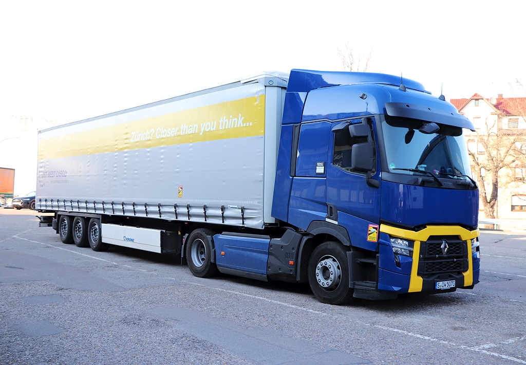 jetzt, d.h. am vergangenen Freitag, konnte ich auch den ersten T Evo mit der "normalen" Kabine fotografieren.Es handelt sich höchstwahrscheinlich um einen T460.19T Pritschensattelzug der Compagnie SUD Express, einer Luxemburger Tochter von Transports Frisaye aus dem Beligschen Lüttich, deren Beschriftung auch die Plane trägt.