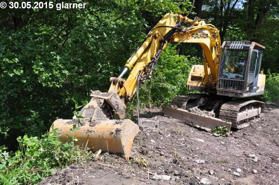 Der Bagger ist mit einer Bohrlafette und einer Seilwinde ausgerüstet und hat Baujahr 2000. Im Normalfall wird er im Forst eingesetzt,hier hilft er beim Bau einer Erschliessung für ein Neubaugebiet im St.Galler Rheintal.