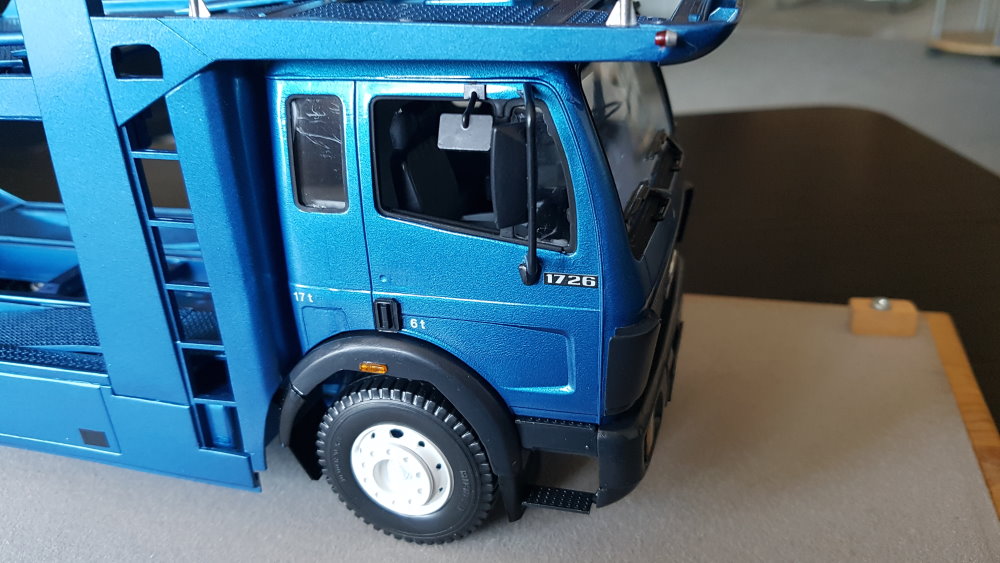 Vor allem wundert mich, das dieses Modell welches im Auftrag von Kässbohrer für Buchbinder 1993 ohne Extras bzw. mit schwarzen Kotflügeln / Stoßstange als 1726er mit dem damals "echtem" Kennzeichen ohne Dekor gebaut wurde. Jedenfalls wurde er so bei der Manufaktur bestellt, und die Firma ist bekannt für Einzelstücke nach Fotovorlagen / Werkszeichnungen. Möglich das es damals als Leasing LKW für einen Kunden bestimmt war hmm