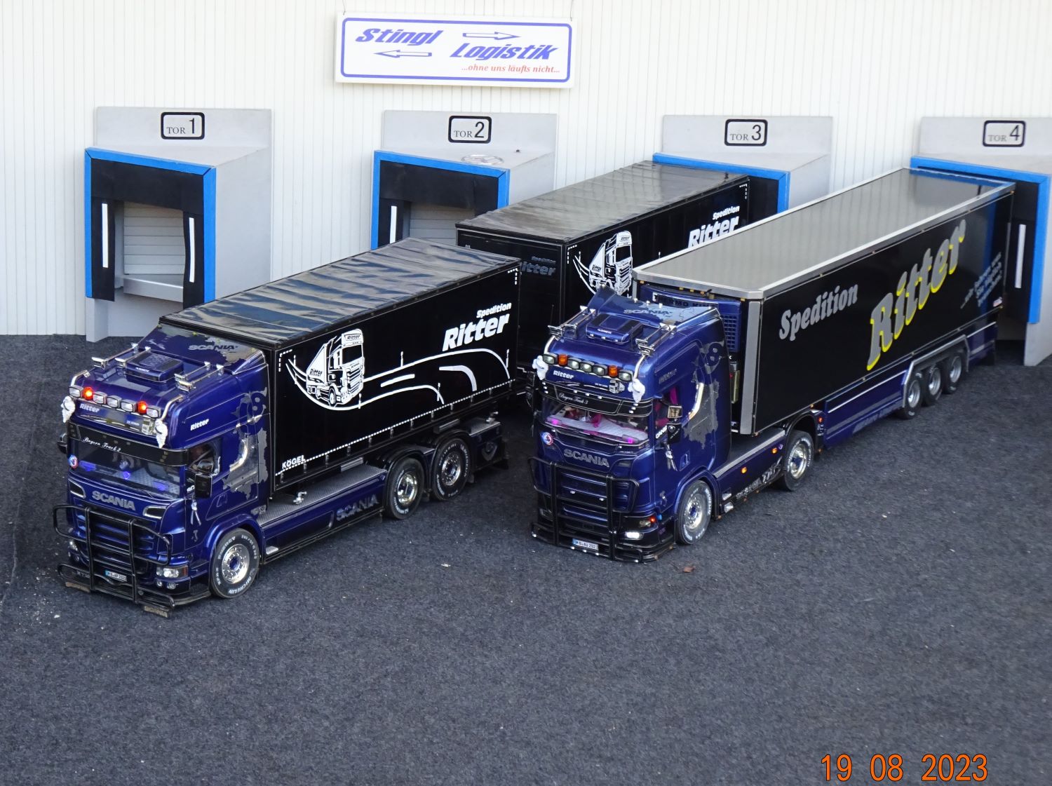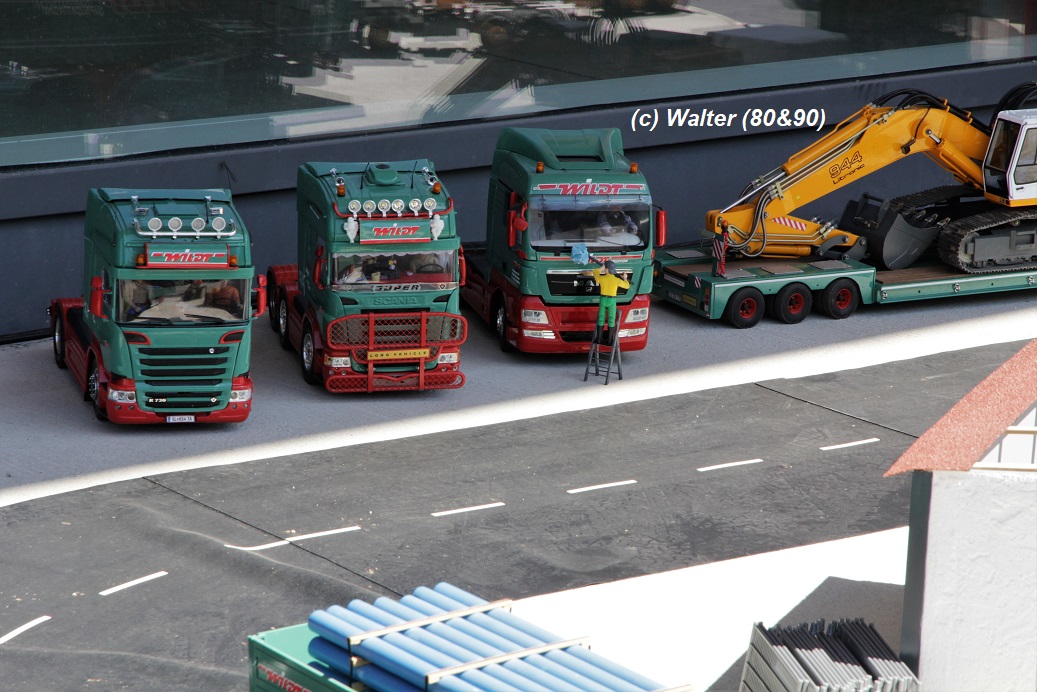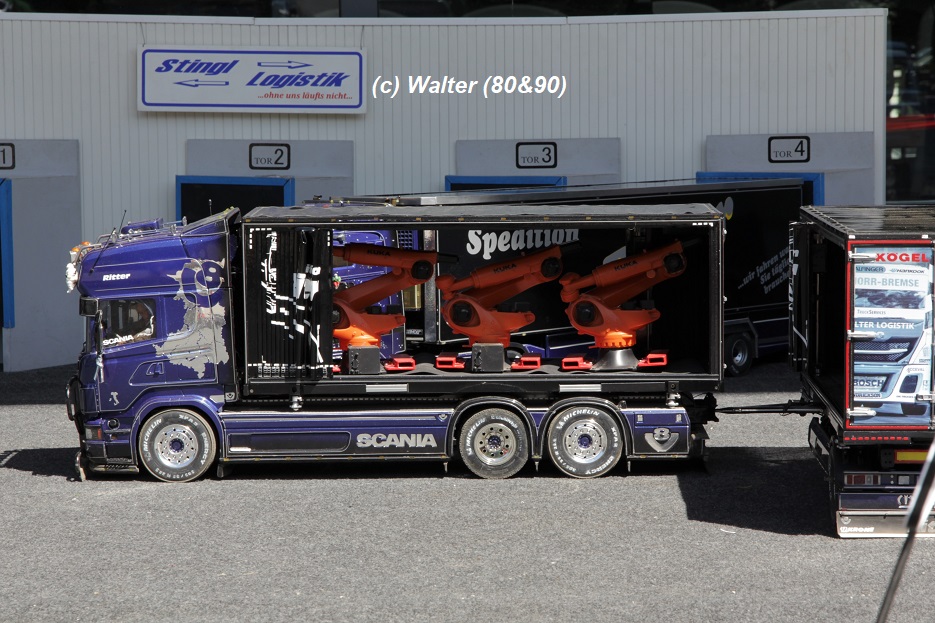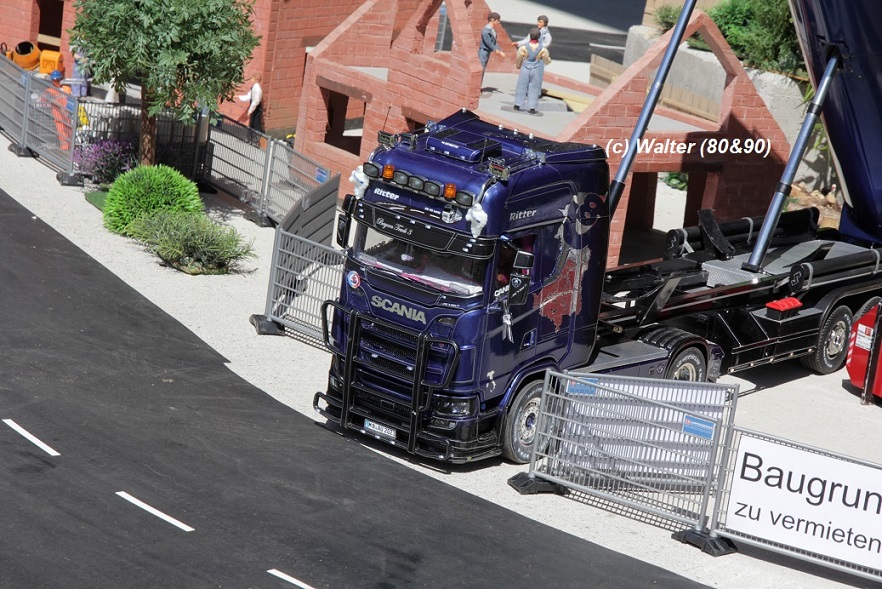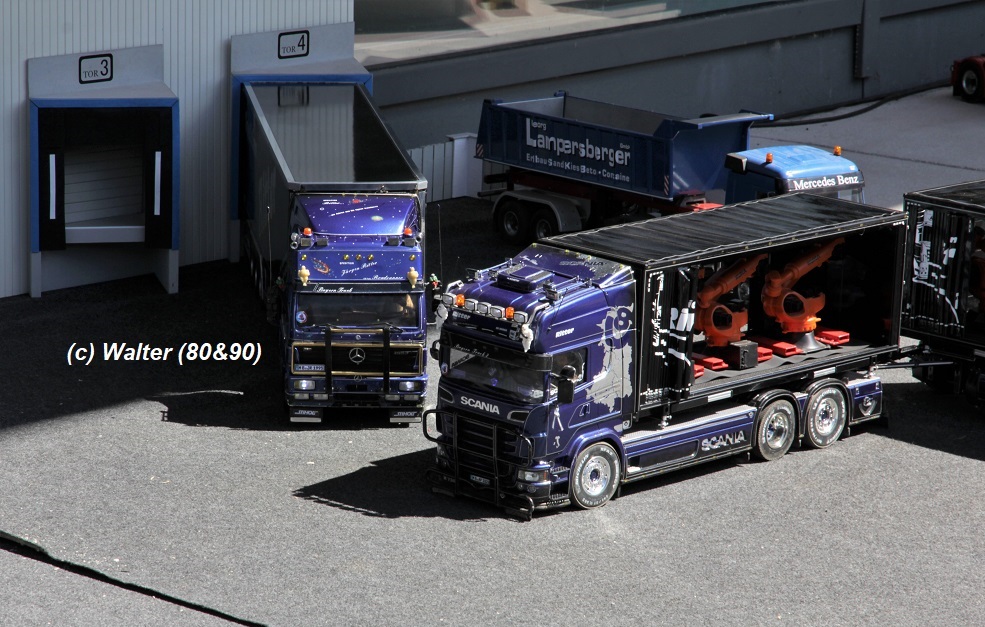 ja, die Modelltrucks waren schon ein Erlebnis. Vor allem die blauen "Ritter"-Trucks. Optisch wunderbar gestaltet, aber auch mit diversen Sonderfunktionen wie z.B. das Öffnen der Schiebeplane, oder das Hochfahren der Luftfederung und das Einklappen der WB-Stützen nach dem Aufbrücken. Oder auch akustisch: der Hund auf dem Beifahrersitz eines der Scanias bewegte sich und bellte!