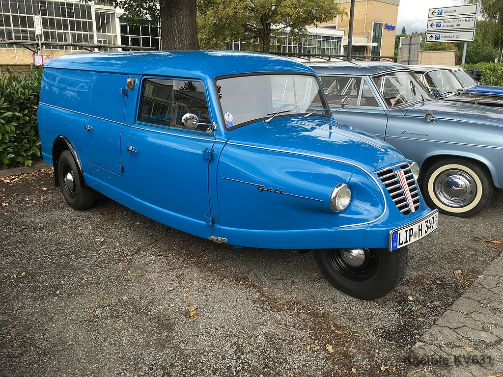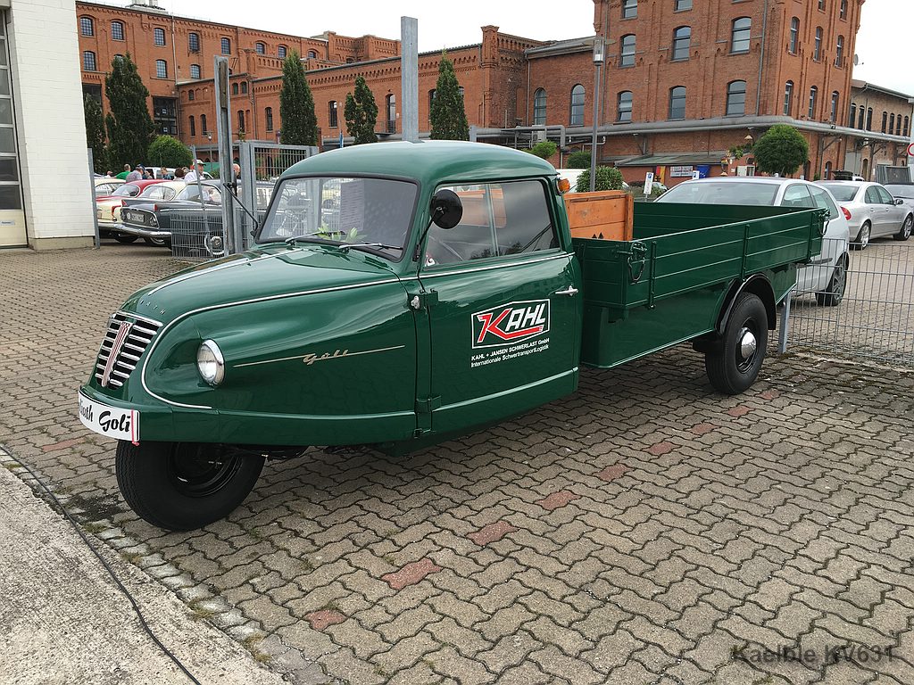 Der grüne und blaue Goli ist die letzte Evolutionsstufe des Goliath-Dreirades mit Zweitaktmotor. Der wurde so bis zum Ende der Borgwardwerke gebaut.