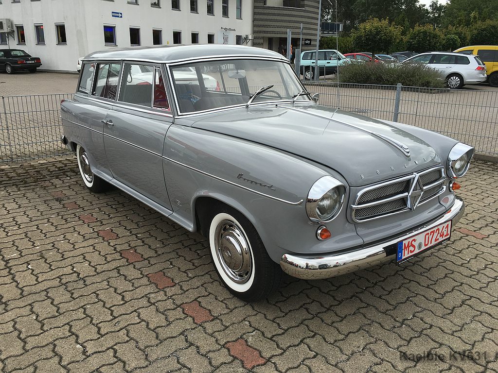 der graue Borgward Combi mit dem Münsteraner Kennzeichen ist ein sogenanntes 62er Modell , d.h. schwarze runde INstrumente u. Armaturenbrett, und die hintere Öffnung ist eine Klappe, wie heute bei den Kombis üblich, und da sollen auch nur (meines Wissens) unter 20 Stück von gebaut worden sein.