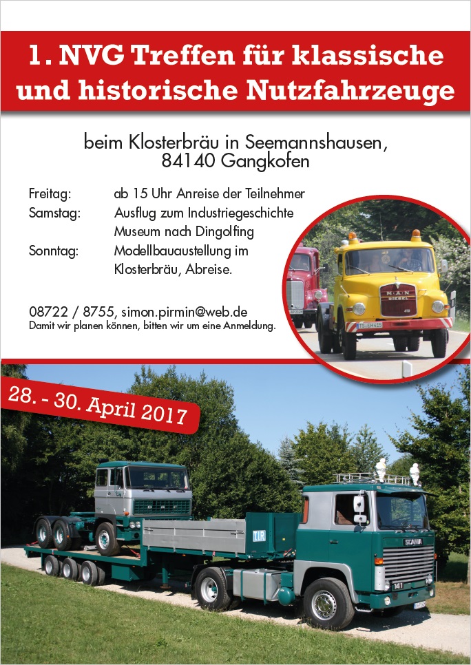 von 28.-30. April 2017 findet beim Klosterbräu in Seemannshausen, 84140 Gangkofen, das 1.NVG Treffen für klassische und historische Nutzfahrzeuge statt.