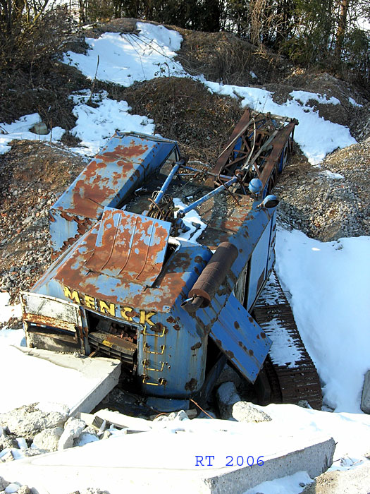Er sieht in der Tat nicht besser aus: Im Oktober 2005 in einer anderen Kiesgrube wenige Kilometer vom alten Standort entfernt fotografiert. Die Kabine ist 20 cm hoch mit Steinen gefüllt, die Vandalen zum einwerfen der Scheiben benutzt haben.