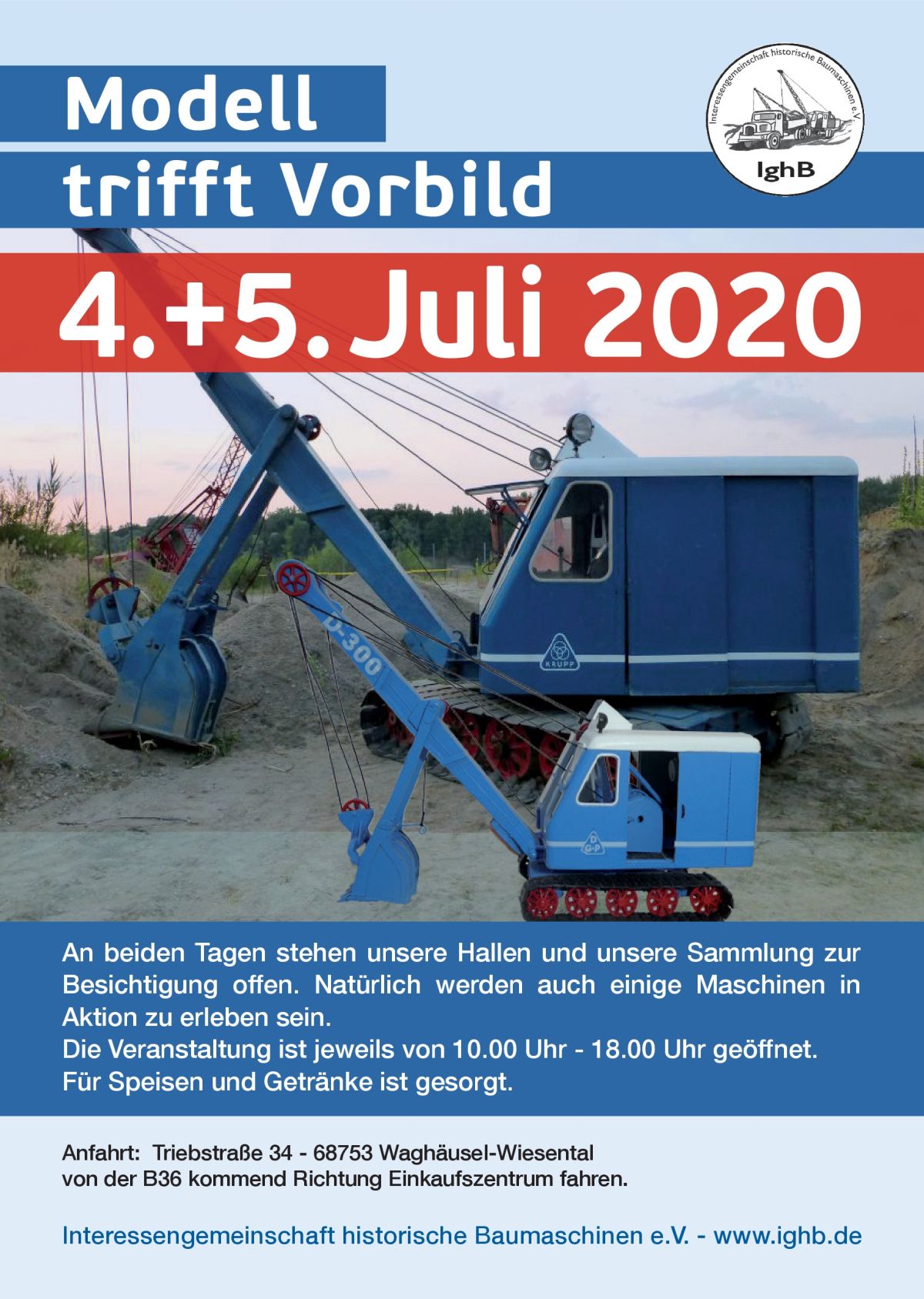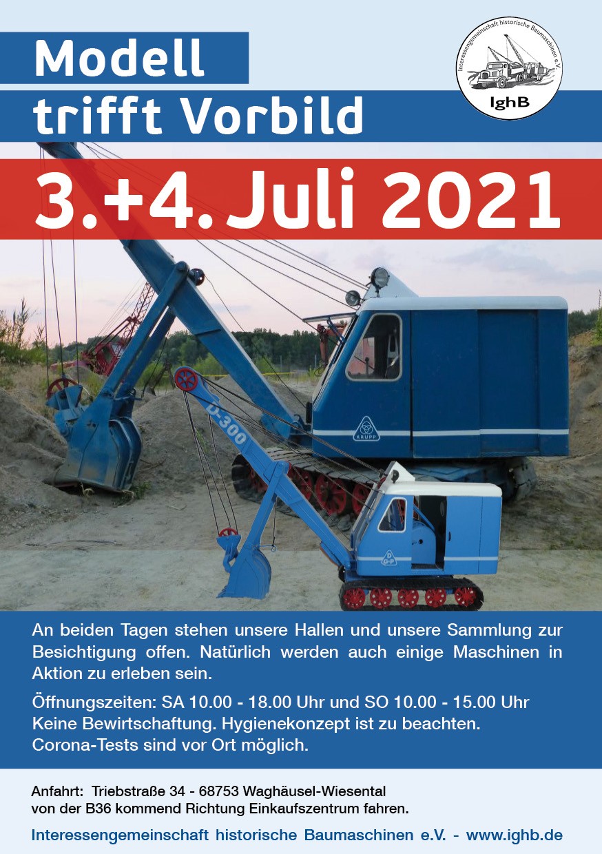 Nun gibt es einen zweiten Anlauf. Nachdem wir doch sehr viele Modellbauer in unseren Reihen haben, wollen wir die interne Veranstaltung aus dem letzten Jahr nun offiziell wiederholen. Ganz kurzfristig haben wir mit unserem Ordnungsamt ein Konzept abgestimmt, unter welchem wir eine Modellbauer-Ausstellung organisieren konnten. Am Wochenende 03./04. Juli 2021 öffnen sich die Tore unserer Hallen. In den Hallen werden Baumaschinenmodellbauer Ihre Modelle präsentieren, Damit sich was bewegt sind noch zwei Modellbahn-Anlagen aufgebaut. Im Aussenbereich werden sich Leute mit ferngesteuerten Modellen austoben, ausserdem ist noch eine LGB-Anlage geplant.