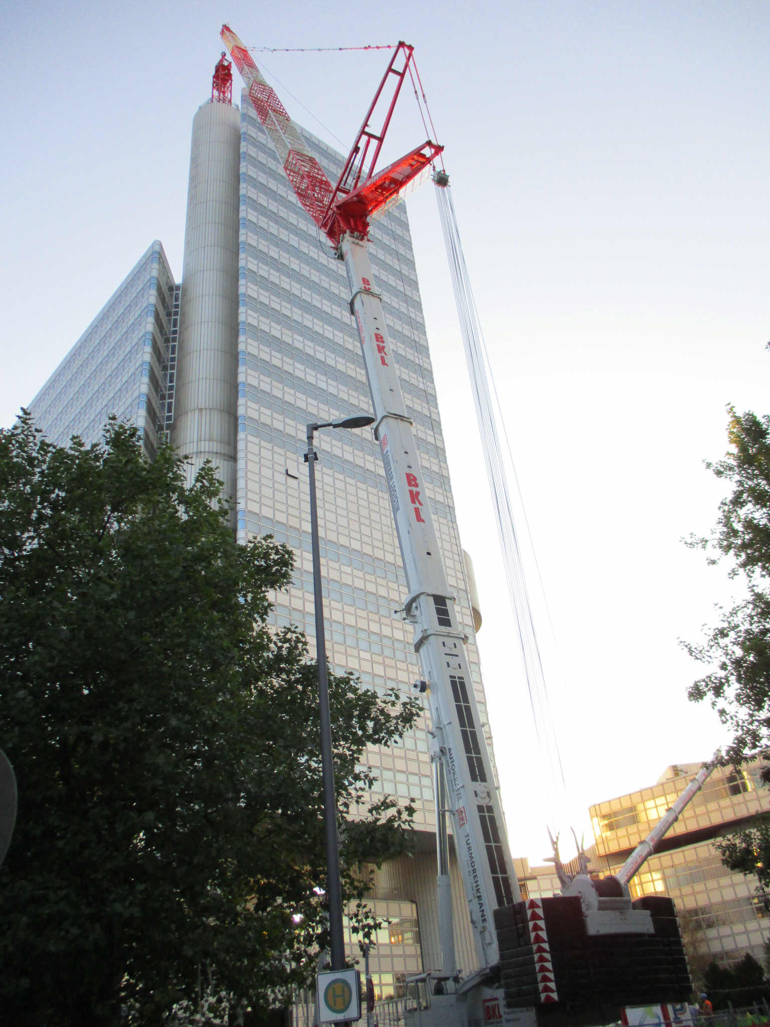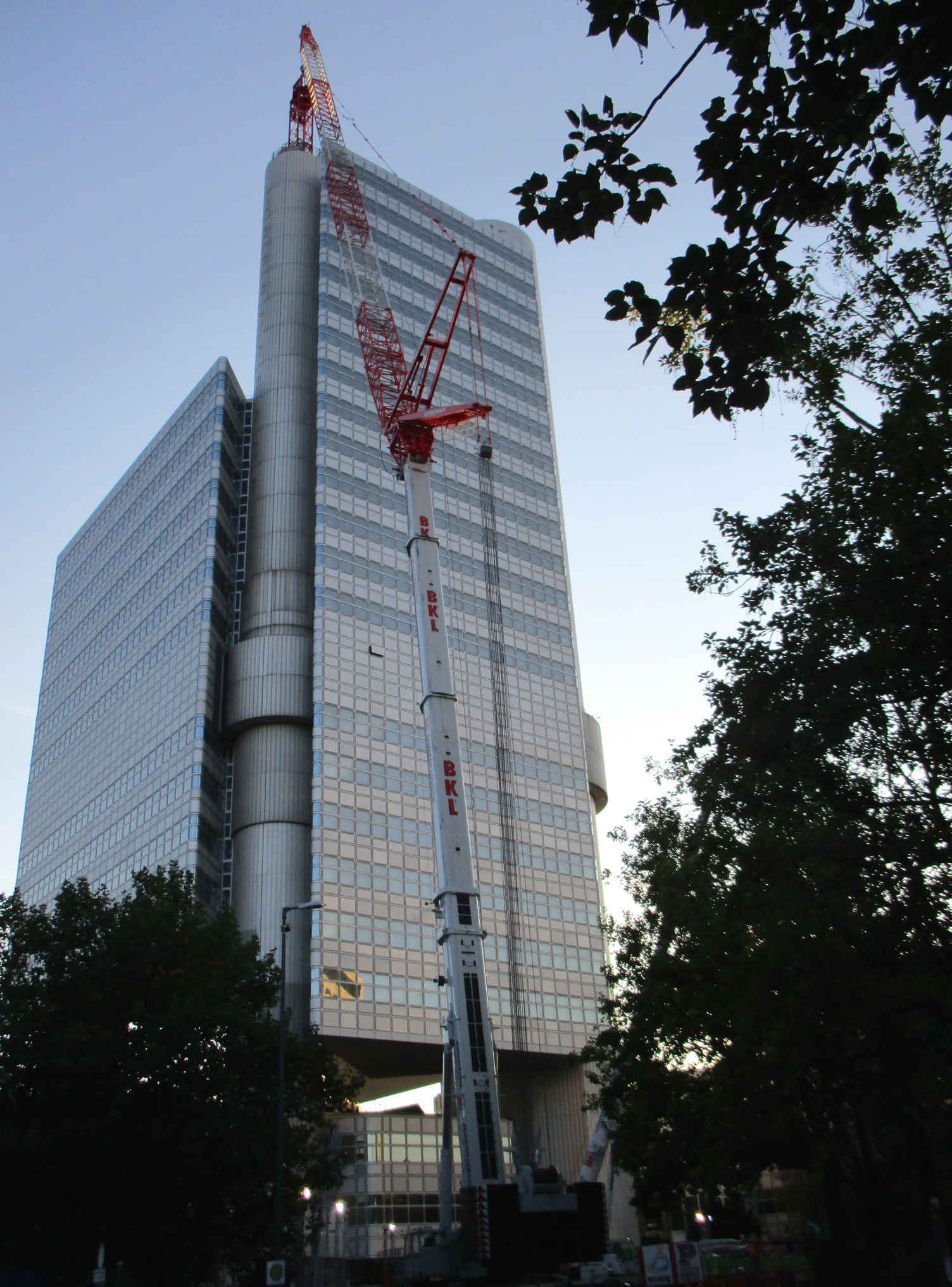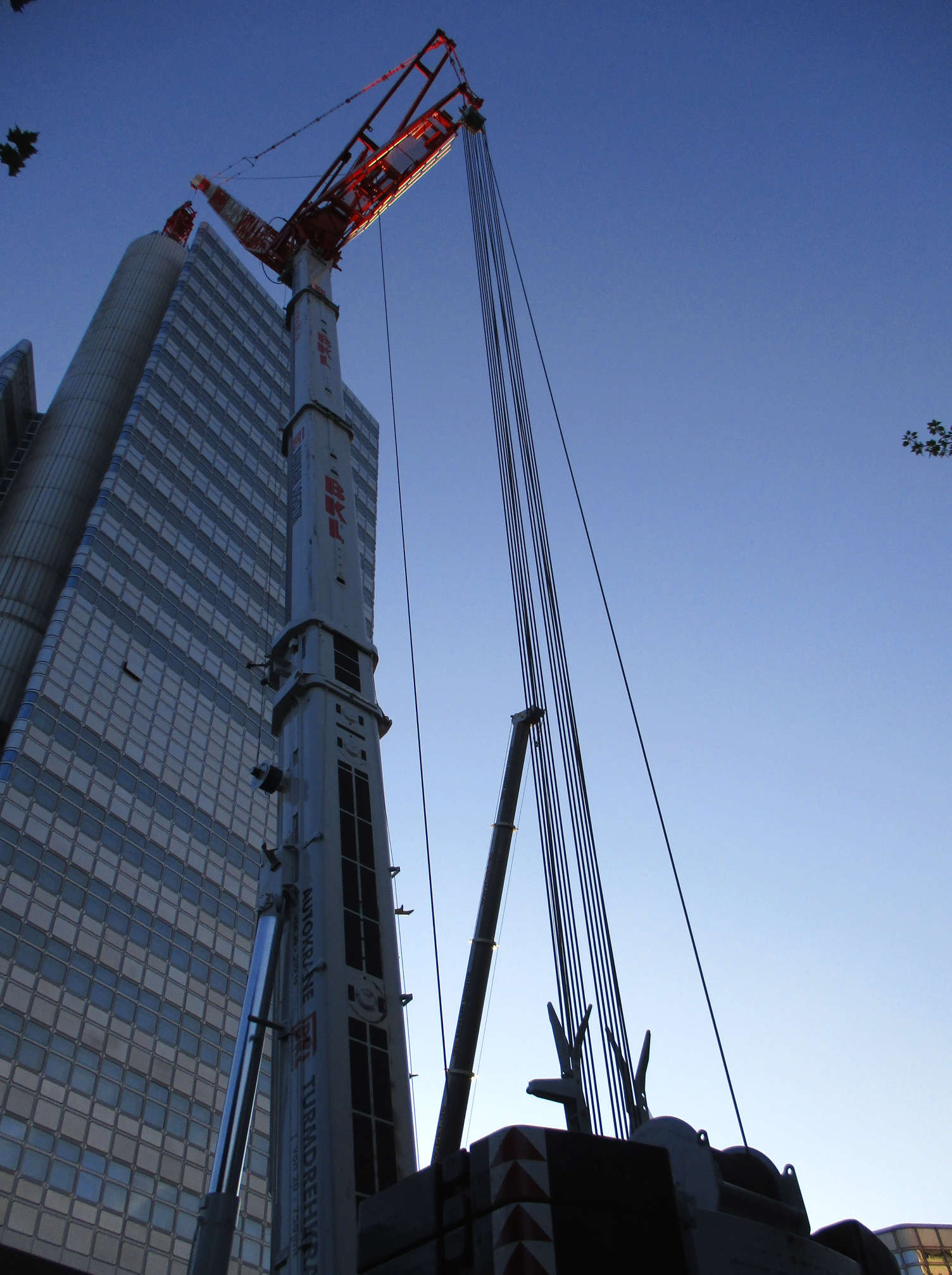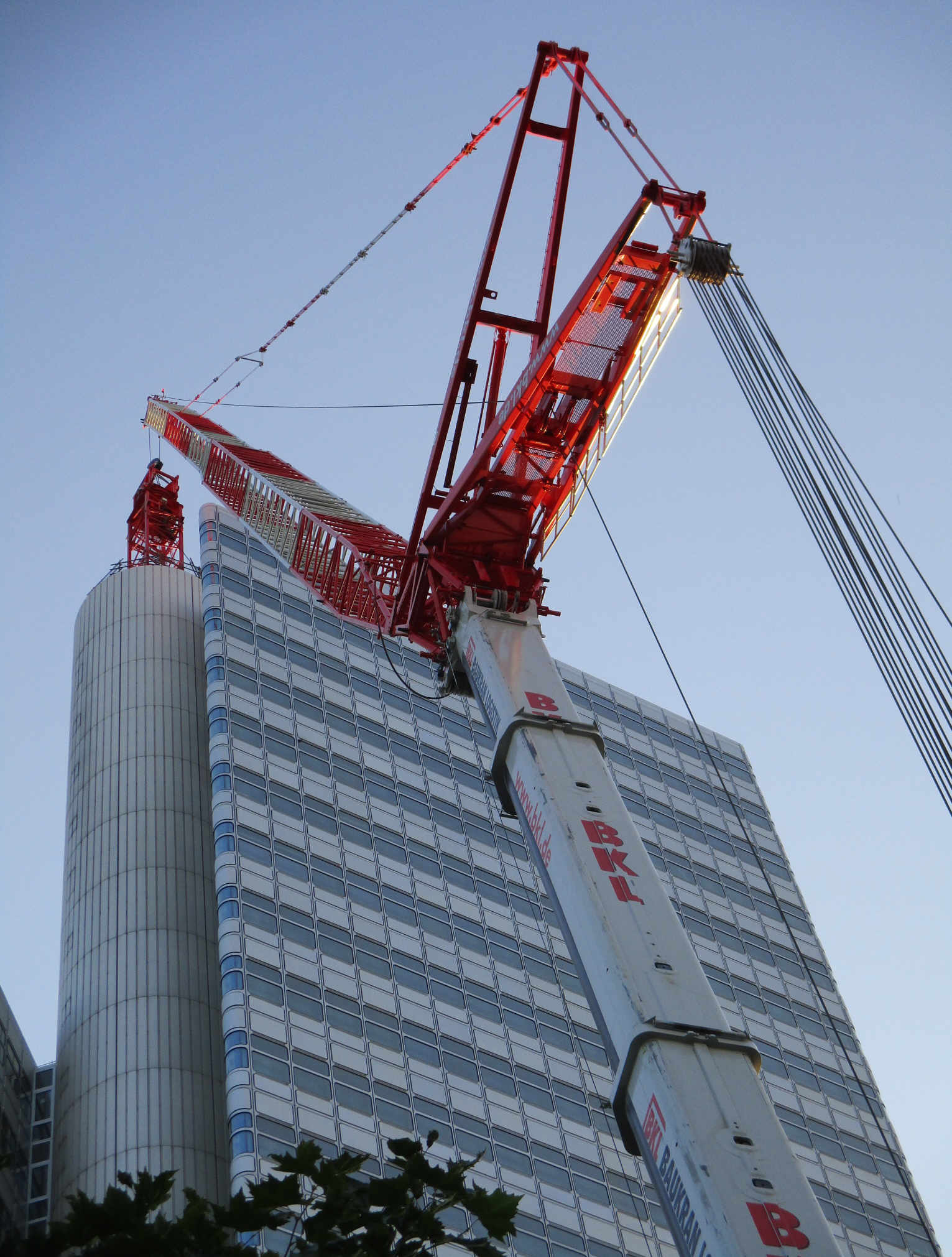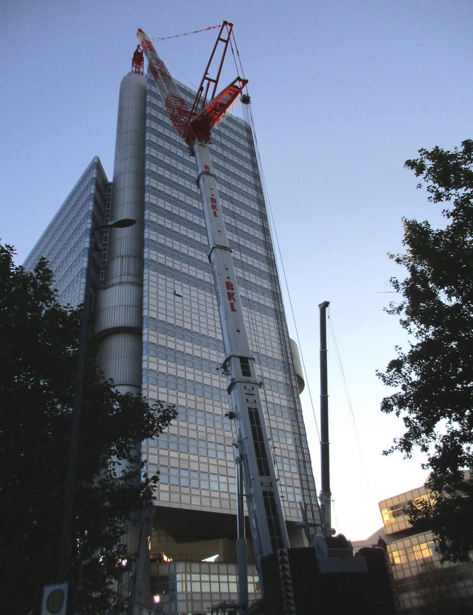 gestern Abend in München: Baukran-Demontage an einem Bank-Hochhaus