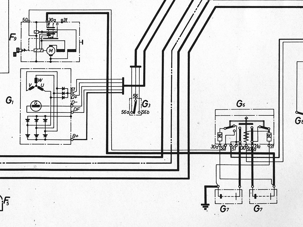 Im Schaltbild sind G7 die beiden Batterien, G6 der Umschalter, G1 die Lichtmaschine und F9 der Anlasser. Am Umschalter ist geneu in der Mitte der Kontakt "50a", da muß man etwas aufpassen, das "a" gehört zur 50.
