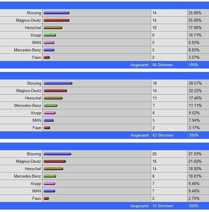 Auf den weiteren Plätzen folgen dann Mercedes-Benz (9 Stimmen, 10,47 %), Krupp sowie MAN (jeweils 7 Stimmen und 8,14 %) und ganz hinten Faun (2 Stimmen, 2,33 %)