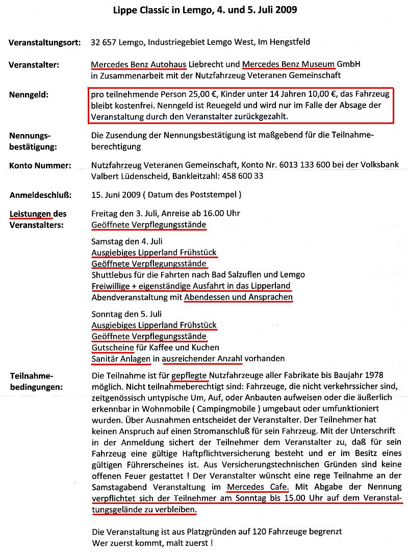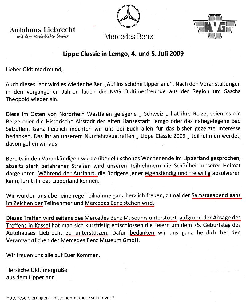 Natürlich war das ganze eine Werbeveranstaltung von MercedesBenz... das ist ja auch okay. Nur - wenn da ständig die Unterstützung durch MercedesBenz gepriesen wird, die darin gipfelt, daß das Lemgoer Treffen sogar ein Ersatz für die abgesagte Veranstaltung in Kassel sein soll ---------- dann frag ich mich natürlich, warum die Teilnehmer dennoch happiges Startgeld zahlen mußten?? Immerhin haben die ja schon jede Menge Geld für die Anfahrt gelöhnt, um die Werbeveranstaltung zu "schmücken"!