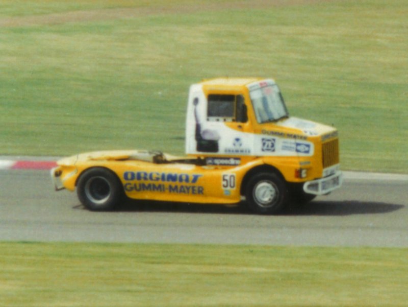 Der rote Mercedes (Nr. 19) wurde übrigens von einer der wenigen Frauen im Truckrennsport, Reinhilde Braun, gefahren.