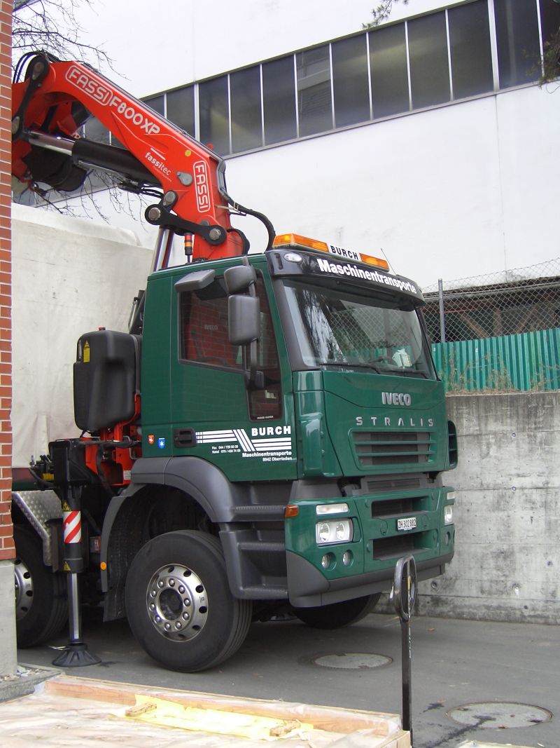 Iveco mit Fassi F800XP beim abladen einer neuen Druckmaschine.
