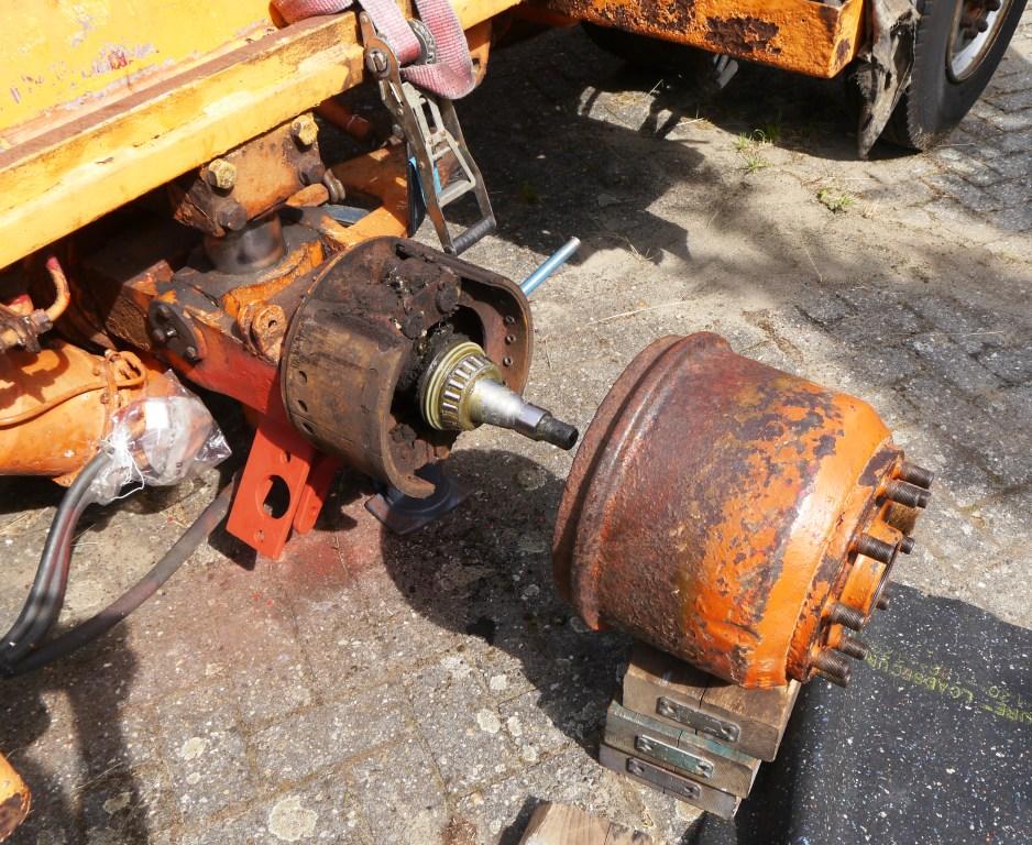 Zusammen mit der sehr schmal bauenden Zuggabel und dem längs verlaufendem Tragrohr unterhalb des Federendes deutet das auf eine Vorderachse mit Achsschenkellenkung hin, bei der wie bei Vorderachsen von PKW und LKW die Räder einzeln über ein Lenkgestänge gelenkt werden.