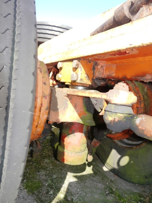 Nur Dank in Längsrichtung eingebauter Federn hatten die Scheuerle-Tieflader Spurstangen gelenkte Fahrgestelle; d.h. jede Halbachse hatte einen eigenen Drehpunkt: