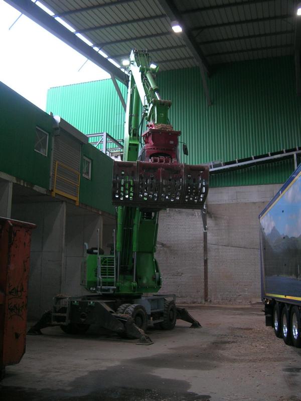 Umschlagbagger Sennebogen 821E im Papenburger Industriehafen Süd beim Umschlag von Schiene auf LKW.