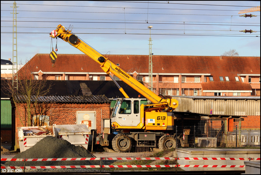 Ein Sennebogen 613 der Bauunternehmung Hofschröer GmbH & Co. KG bei Bauarbeiten am Bahnhof in Leer/Ostfriesland: