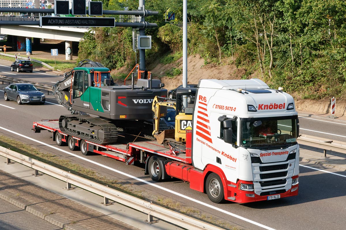 Ein Scania von Knöbel, mal mit Baggern statt Containern oder Modulen (Saarbrücken, 2021):