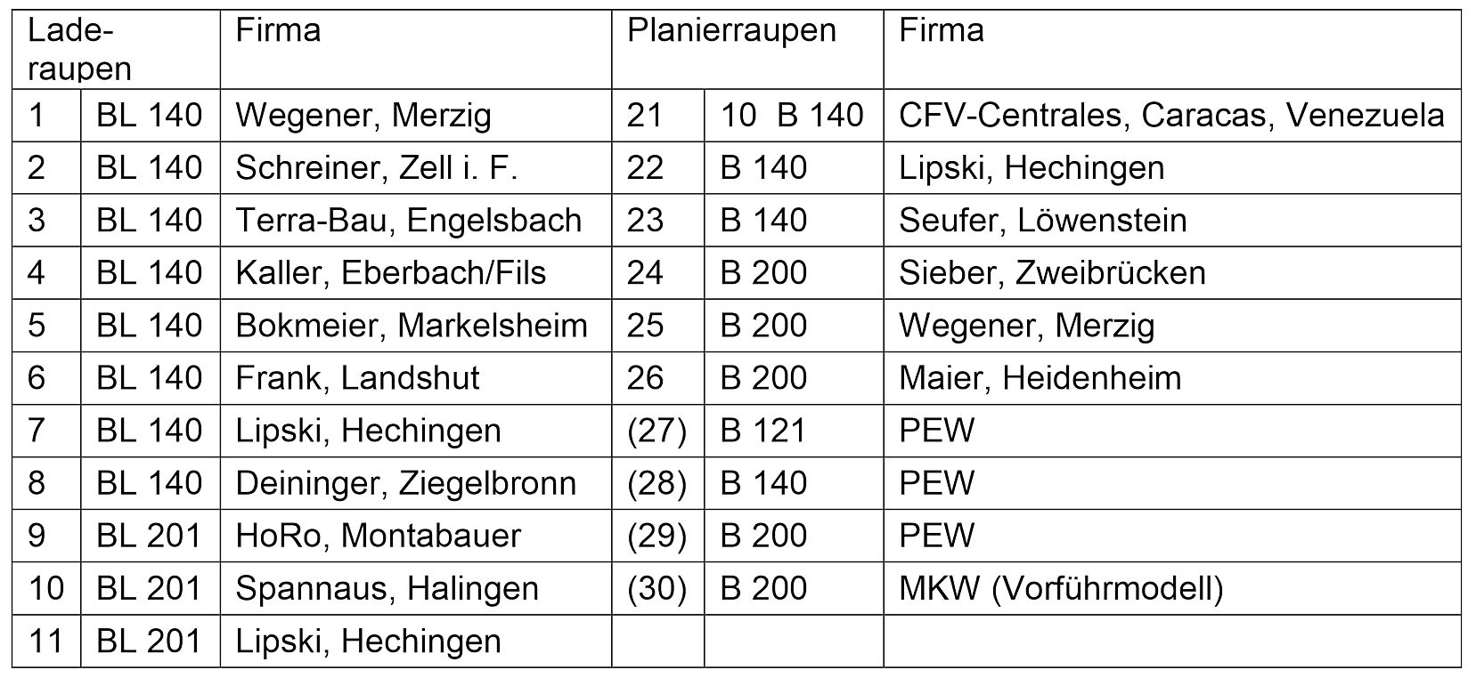 Aus einem späteren Protokoll der Gesellschafterversammlung der BBF geht hervor, dass für 1976 bereits 26 Büffel-Raupen vorbestellt waren. Die vorbestellten sind in der angehängten Tabelle aufgelistet.