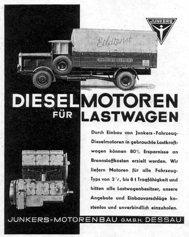 Hier macht Junkers 1933 Werbung für den Austausch des Motors bei einem gebrauchten Dürkopp, nachdem die Berliner Fabrik geschlossen wurde.