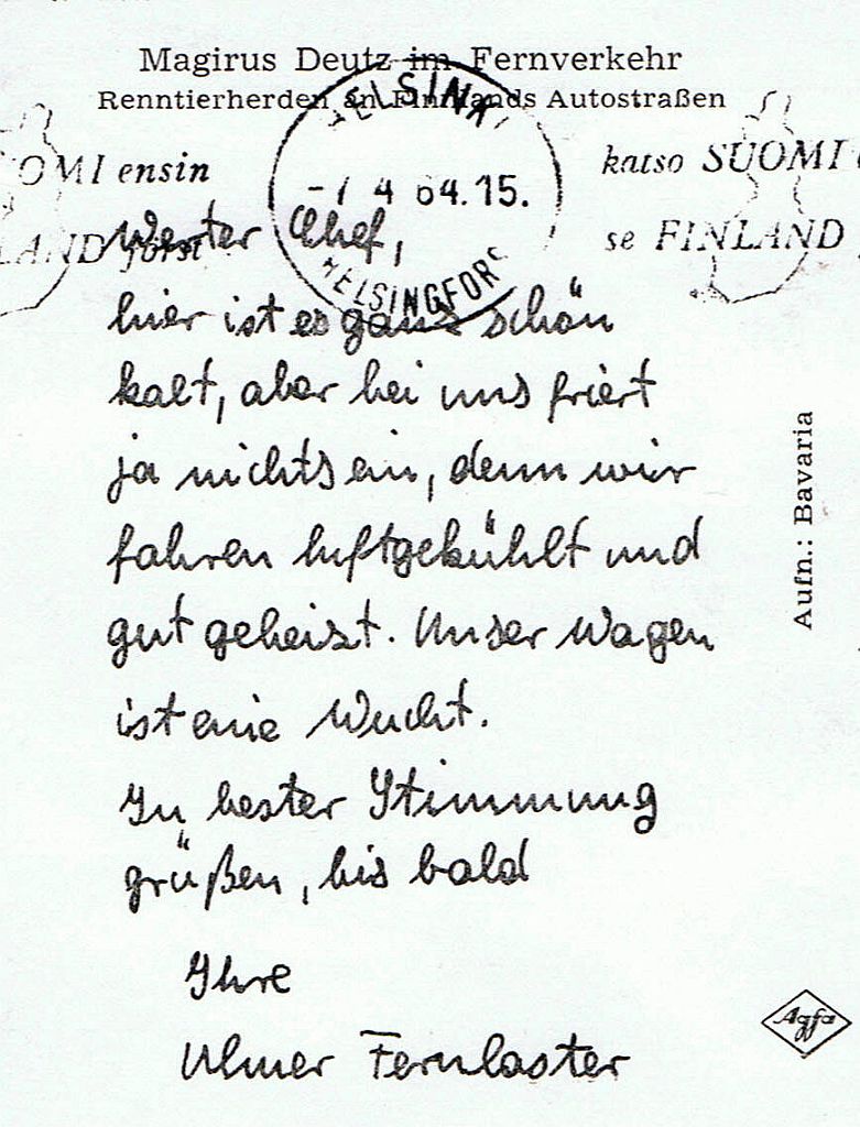 Werbepostkarte mit einem Magirus Pluto 200 F-L in Lappland. Achtet auch einmal auf den sinnigen Text der Postkarte.