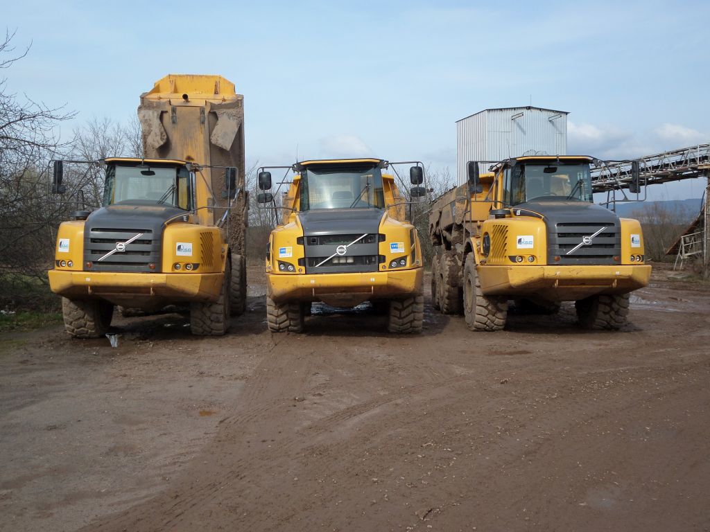 2x Volvo A25E (rechts und links), 1x Volvo A25F (Mitte)