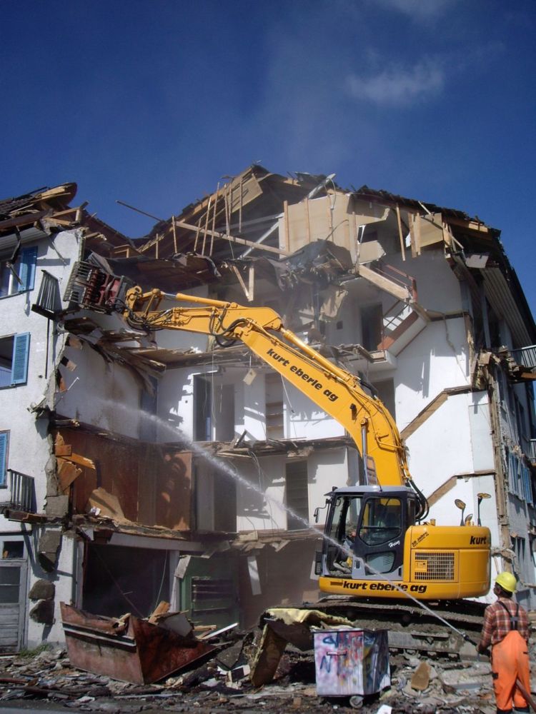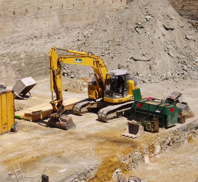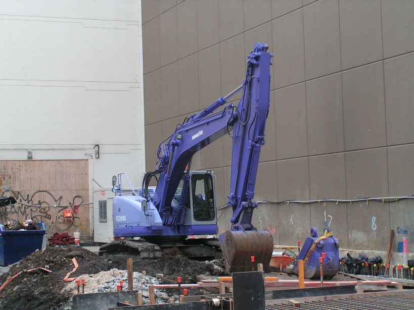 Hier mal eine besondere Ausfuehrung, mit ausfahrbarem Stiel. Der bagger hebt gerade eine Baugrube aus fuer ein Hochhaus in einer sehr schmalen Bauluecke.