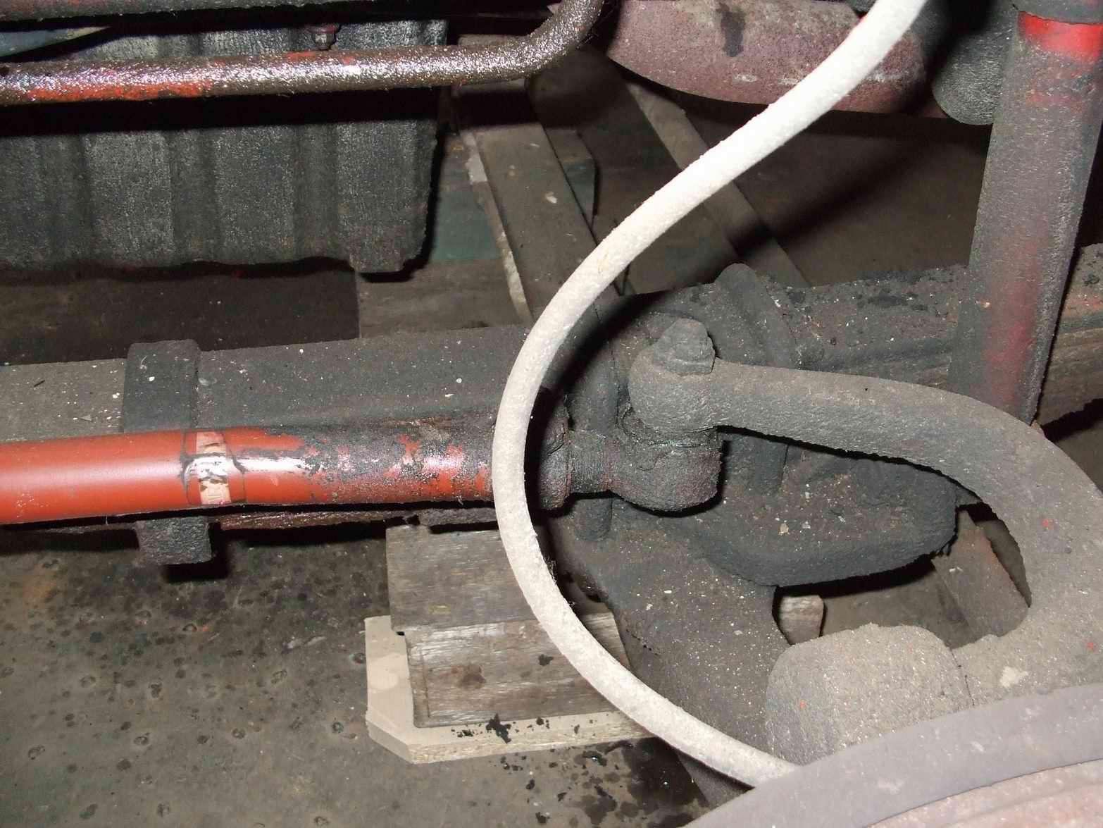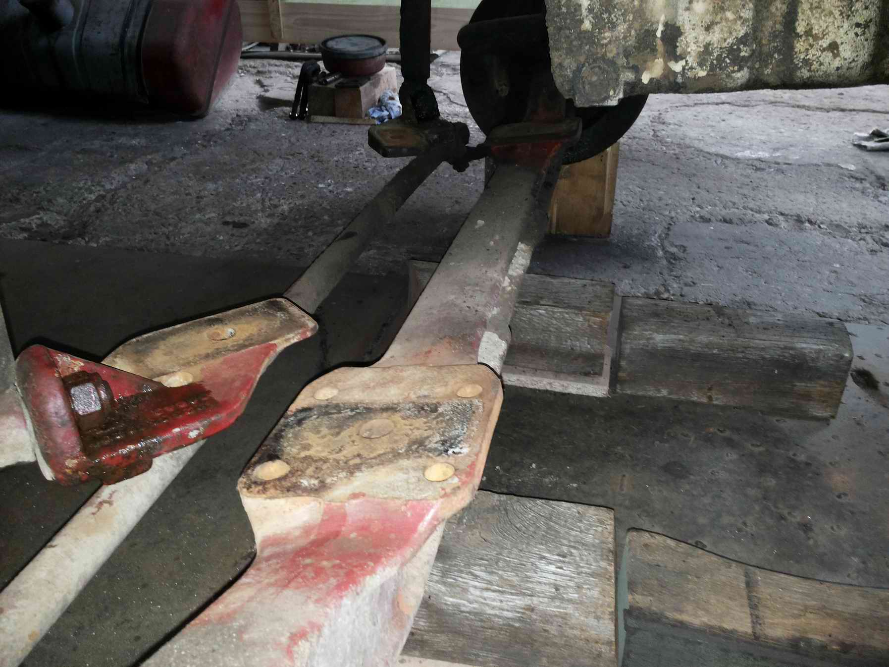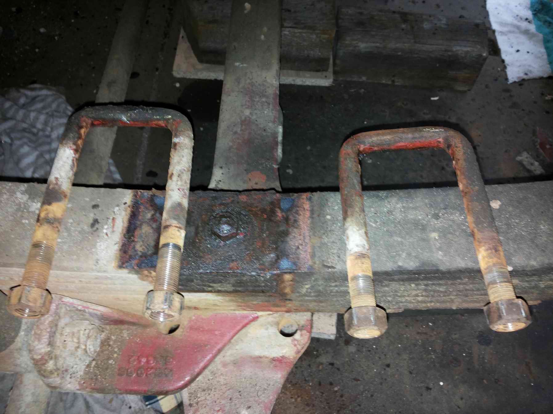 Bin gerade dabei, das Ausbauen der Blattfedern vorzubereiten. Das Auto ist arbeitsgerecht unter dem Rahmen aufgebockt, die Blattfedern sind vollkommen entlastet, die Augenbolzen sind schon lose. Die Federbriden habe ich schon vorher mal der Reihe nach vorgelöst und wieder angezogen, damit sie im aufgebockten Zustand leichter abzubauen sind.