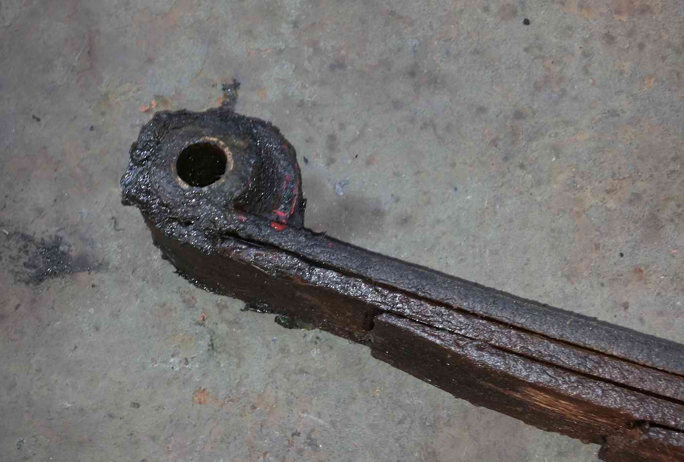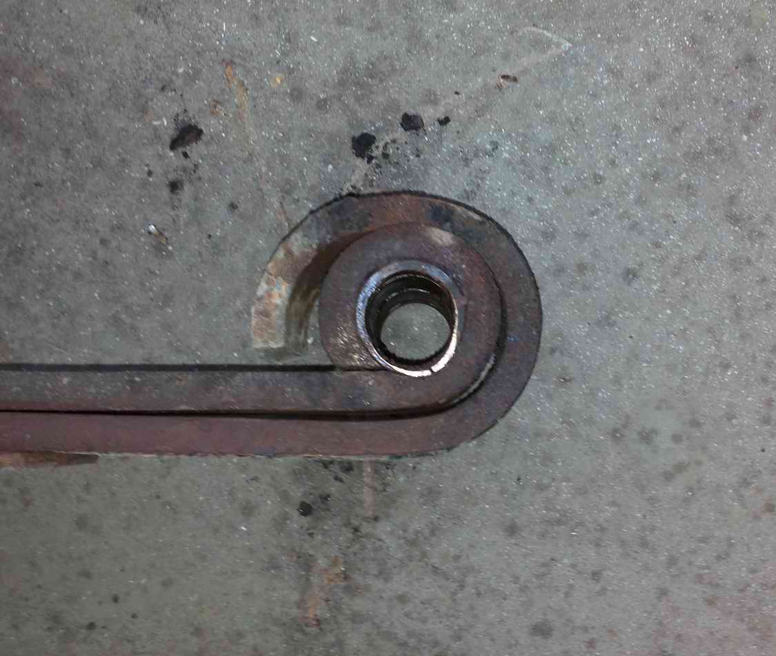 In der Zwischenzeit habe ich auch das Bronzelager aus dem Federauge ausgetrieben, Durchmesser außen von 28,05 bis 28,42 mm